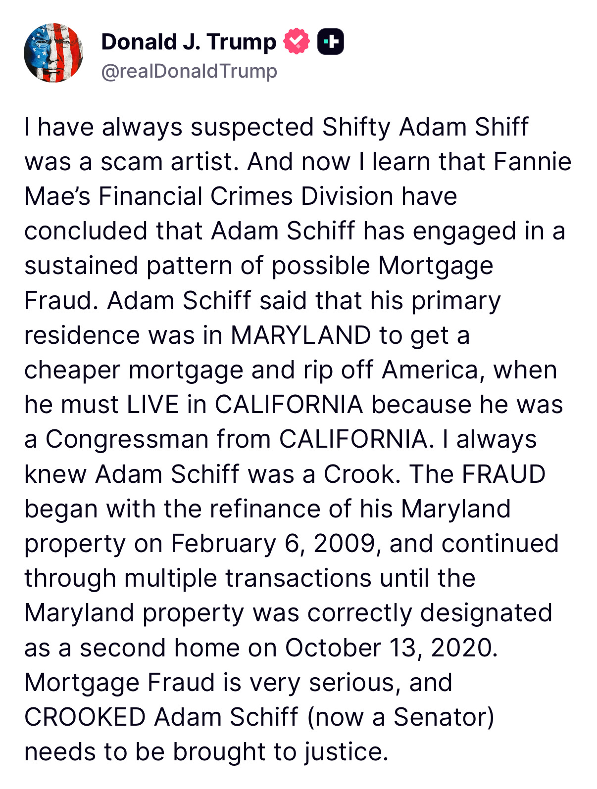 So, to exactly no one’s surprise, another back-and-forth has erupted, and it merits coverage because it’s happening. As someone analyzing this with a tilt toward the president, I’m skeptical of the latest accusations’ veracity but yesterday Trump posted on Truth Social alleging Schiff committed “possible mortgage fraud” by misrepresenting a Maryland home as his primary residence from 2009 to 2020 for better mortgage rates.