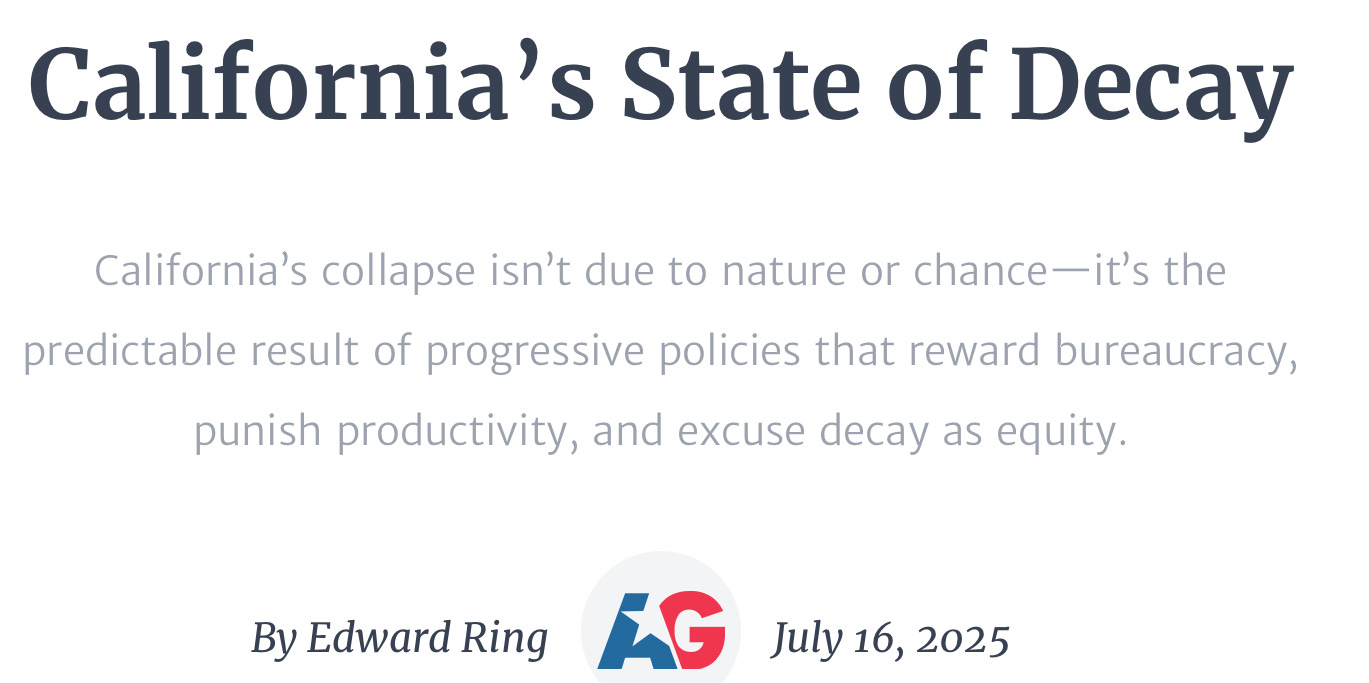 Edward Ring’s American Greatness column today argues California’s progressive policies cause moral and functional decay, hidden behind equity and environmental rhetoric. He cites failing schools, rising crime, and budget deficits, driven by choices inflating living costs and stifling innovation. Ring highlights Highway 1’s closure from landslides, blamed on climate change, not neglect. He calls progressivism a “grift” benefiting special interests, eroding quality of life with neglected infrastructure like dying redwoods, labeling it a human and financial tragedy.