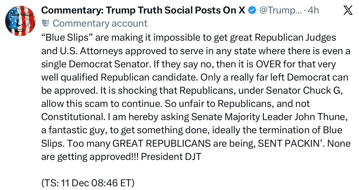 This is one of my afternoon columns, where most of the political insights and strategic implications on a topic live below the paywall. What you see above the break is only the visible portion. The more profound questions — how the blue slip evolved, how California’s senators use it, and why Senate Republicans continue to defend it — are reserved for paid subscribers who support this work directly.