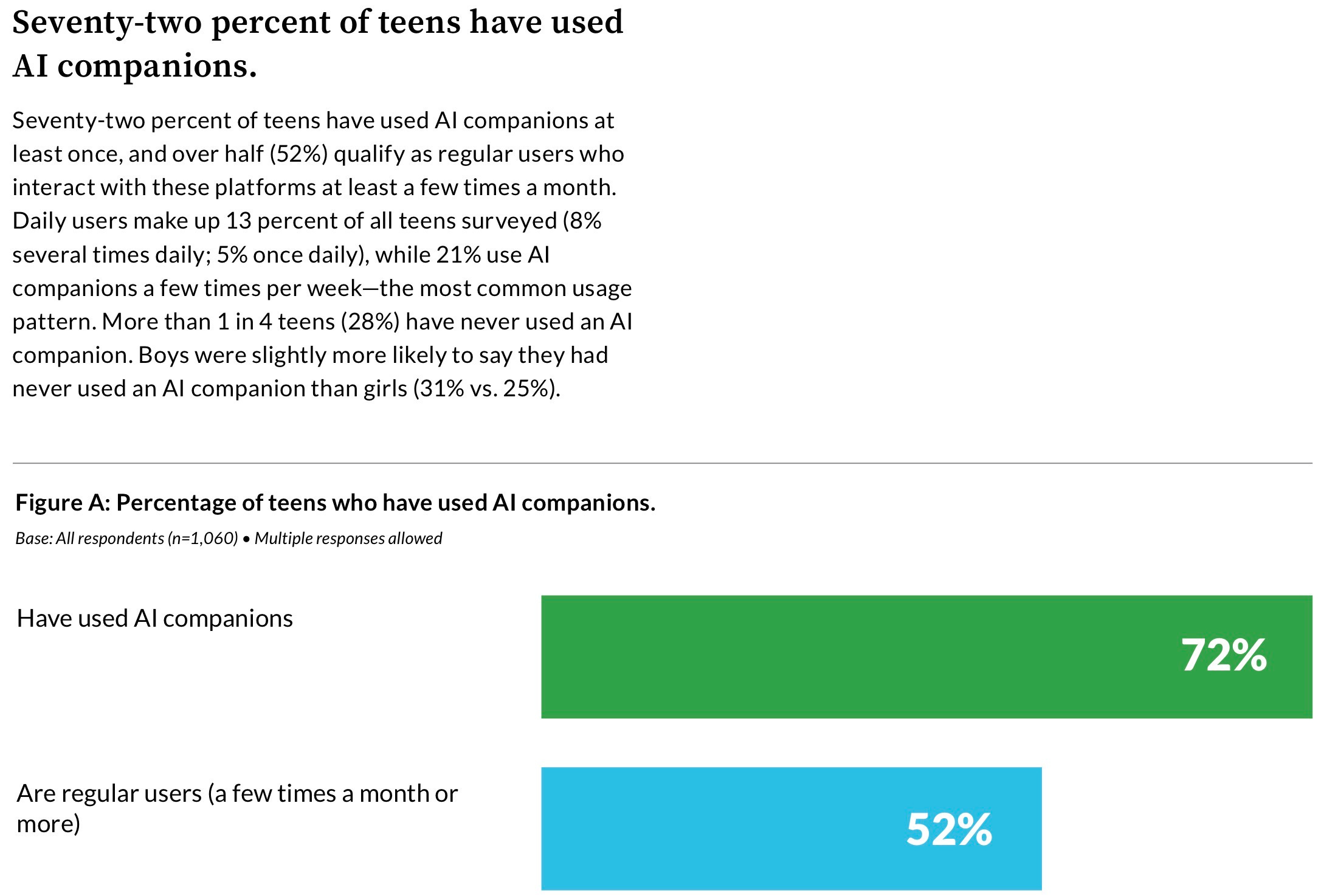 Also, a survey conducted by Common Sense Media is mentioned in the story. An informative report on it is available here; below, I have included the most critical data. 72% of American teens have used an AI chatbot (e.g., ChatGPT, Grok, Gemini).
