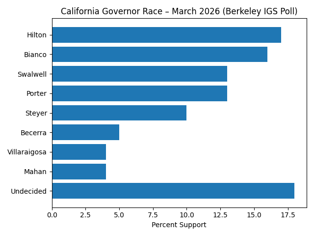 The latest UC Berkeley IGS Poll offers a revealing snapshot of California’s gubernatorial race — and it is one that is easy to misinterpret at first glance. On the surface, Republicans appear to be gaining ground, with Steve Hilton at 17% and Chad Bianco at 16%, placing them at the top of the field.