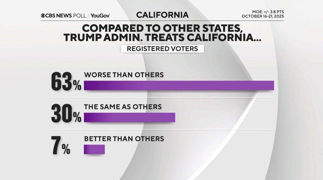 A recent CBS News poll finds a health majority support for Prop 50 — 62% yes versus 38% no — unsurprising in a state dominated by Democrats. Voters inclined to say “yes” frame the measure as a statement against federal policies that sideline California, but you know it’s also a vote of dissatisfaction with President Trump. That is born out by a survey question (see a graphic further down).