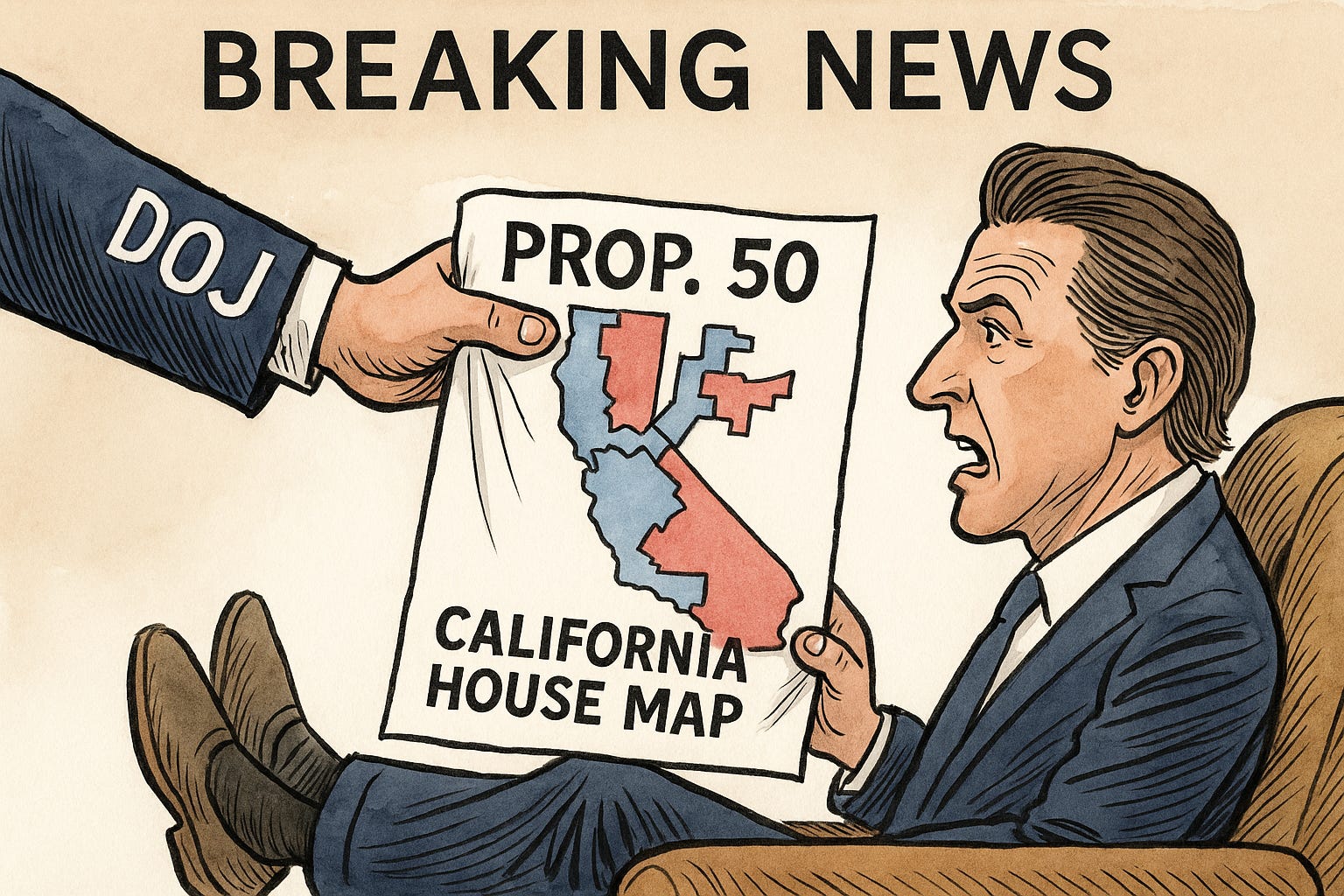 The U.S. Justice Department filed suit Thursday in California federal court to block Proposition 50, the voter-approved constitutional amendment that redraws congressional districts to give Democrats a path to flip five Republican-held seats in 2026. Joining a California GOP challenge, the Trump administration accuses Gov. Gavin Newsom of racial gerrymandering by using Hispanic voter concentrations as a proxy to maximize Democratic gains, violating the Equal Protection Clause.