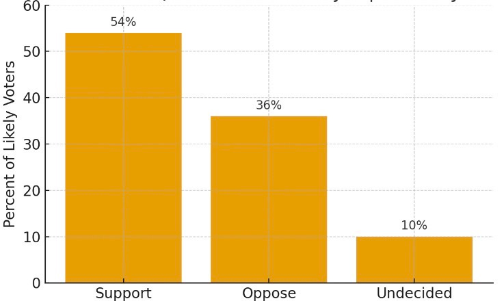According to new Punchbowl News reporting by Ally Mutnick, a survey from GOP-aligned firm co/efficient finds 54 percent of likely California voters support Proposition 50 — the November ballot measure that would transfer redistricting authority from the state’s independent citizens’ commission to heavily gerrymandered lines drawn by the legislature. In this survey 36 percent oppose 50, with 10 percent undecided. It is likely that most of the undecided votes, if pressed, would vote no, based on how undecided voters tend to break on ballot measures.