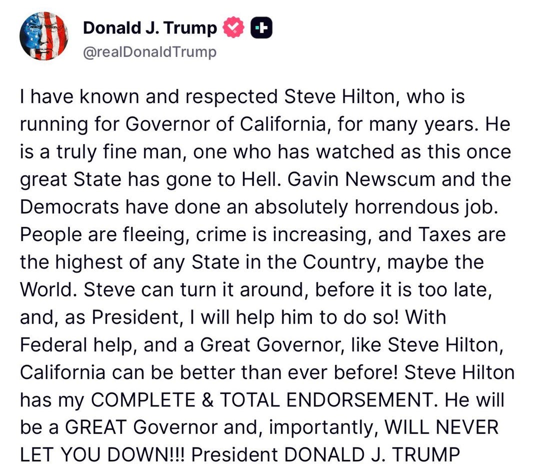 This weekend California Republicans will gather for their convention in San Diego where they will consider whether to endorse in the Governor’s race. People who are decent at head counting had handicapped as of now that it was unlikely that either Hilton or Bianco would garner the 60% of the votes required to get the endorsement. But that Bianco was in a slightly stronger position than Hilton. Well, obviously this endorsement from the President for Hilton will supercharge his momentum going into the weekend convention.