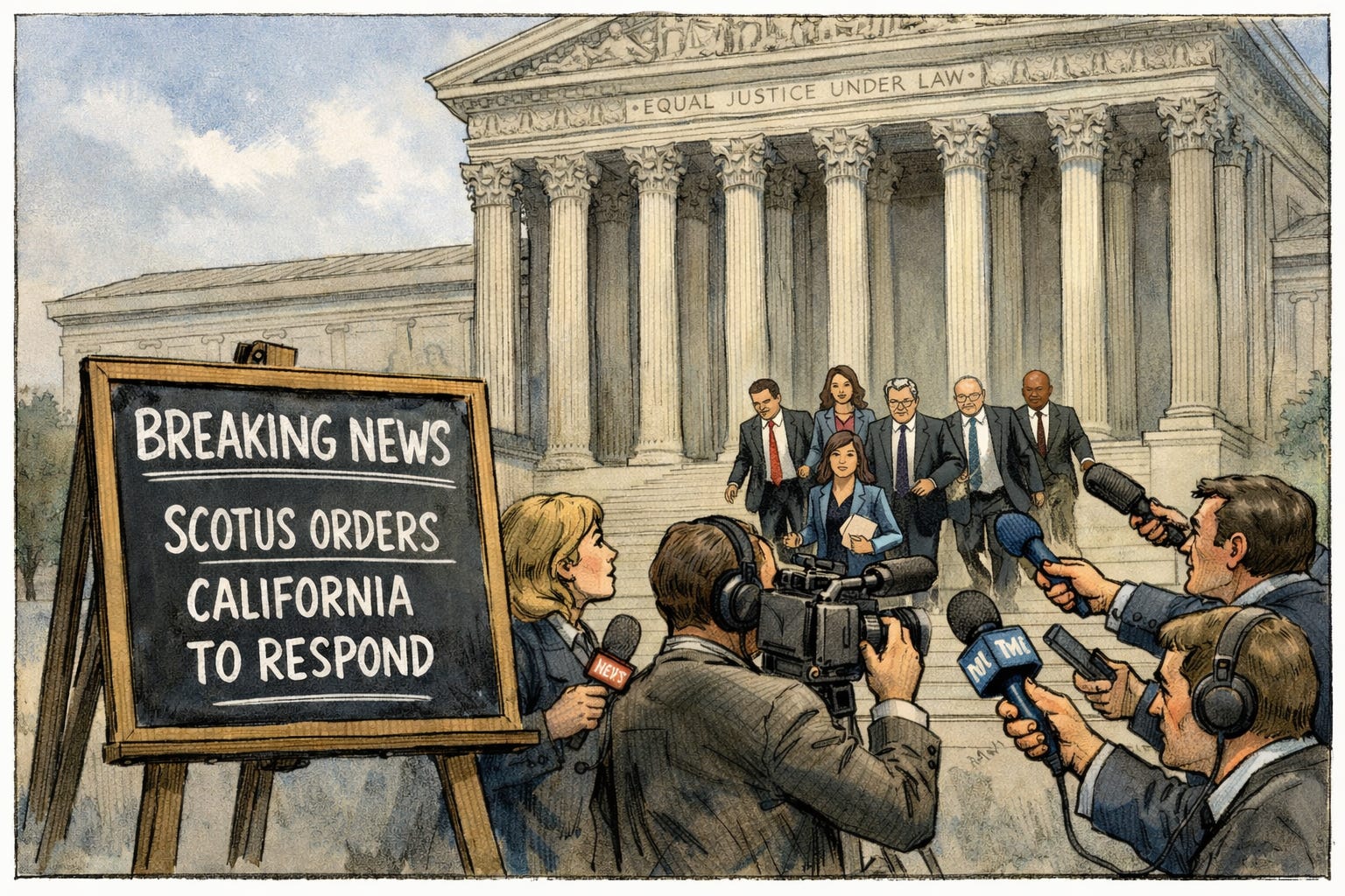 This morning, the U.S. Supreme Court took a significant step that election lawyers recognize. The justices ordered California to respond to an emergency application challenging the congressional maps enacted under Proposition 50, with a response due by January 29. While this may appear procedural, it is not routine. Emergency applications are often denied without comment, sometimes within days. When the Court requests a formal response, it signals that the matter warrants serious consideration.