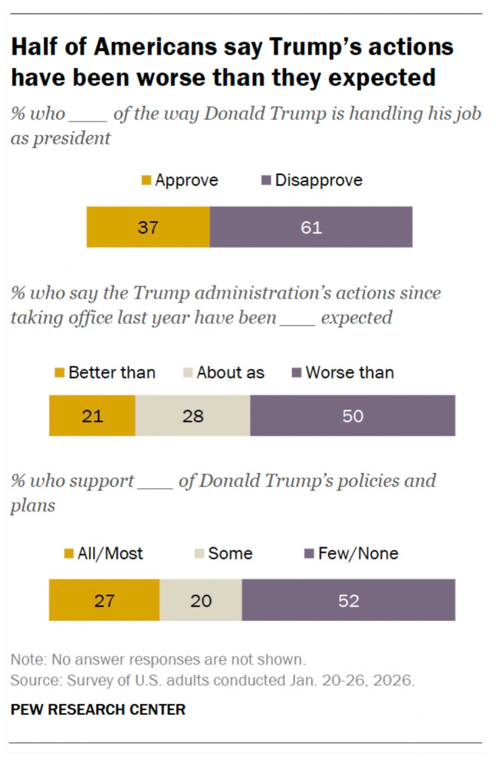 The latest national survey from the Pew Research Center shows President Donald Trump’s job approval at 37%, with 61% disapproving, down from 40% approval last fall. Just 27% of Americans say they support all or most of his policies and plans, compared with 35% at the start of his second term last year. The drop in policy support is not coming from Democrats, who were already opposed; it is occurring within the Republican coalition.