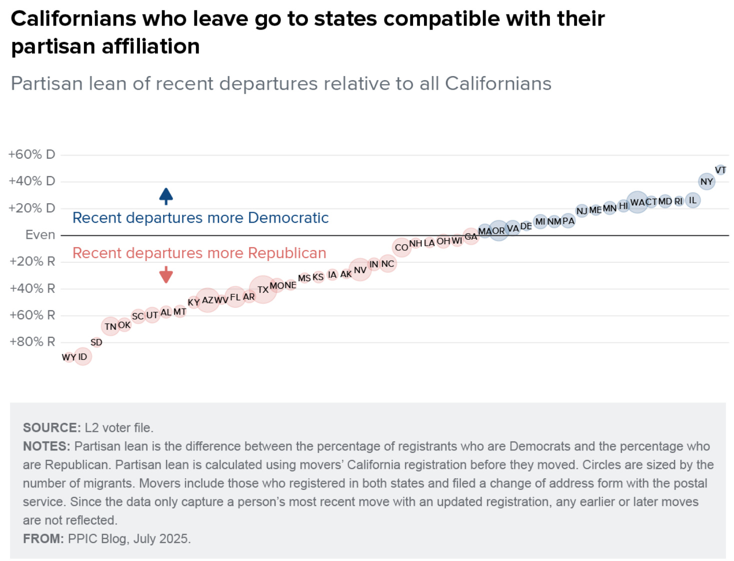 New data from the Public Policy Institute of California shows Republicans fleeing California for red states while Democrats pour in. So, does it matter?