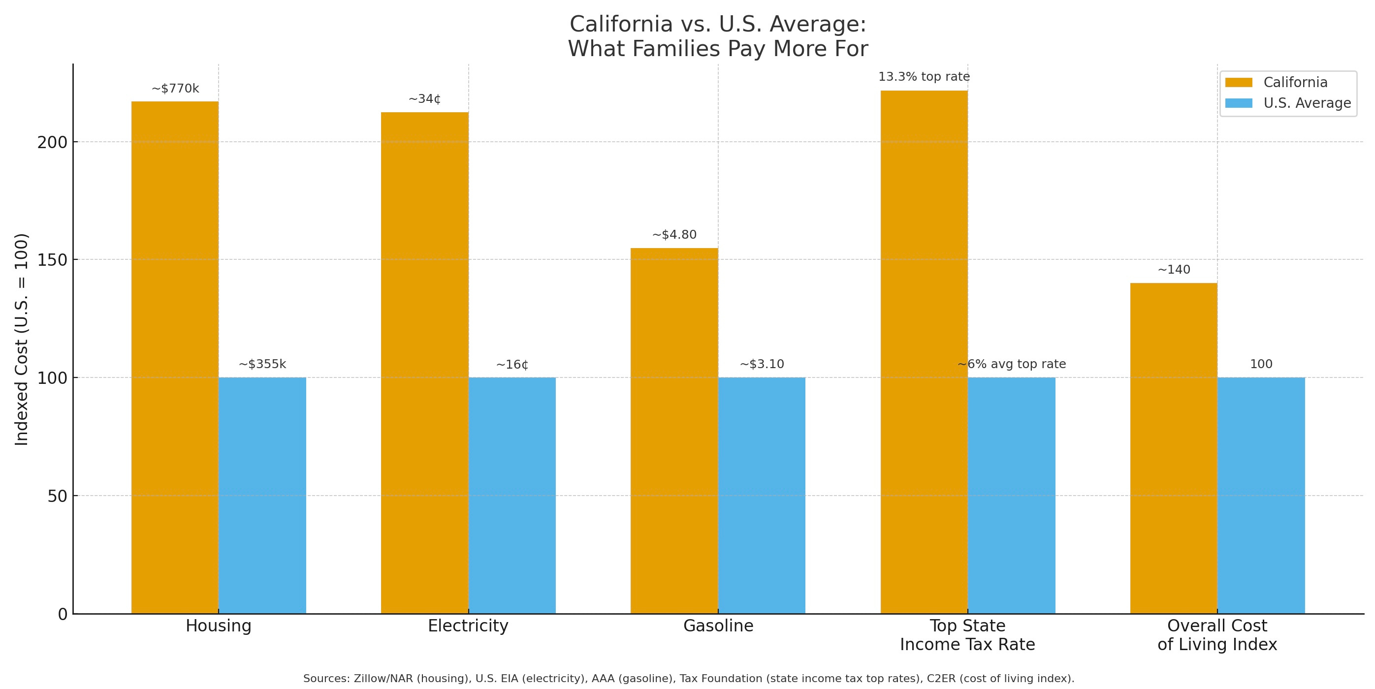 One recent cost-of-living study found that a typical upper-middle-income California family now pays about $30,000 more per year than a similar family elsewhere in the United States, after factoring in housing, utilities, healthcare, taxes, and other basics.