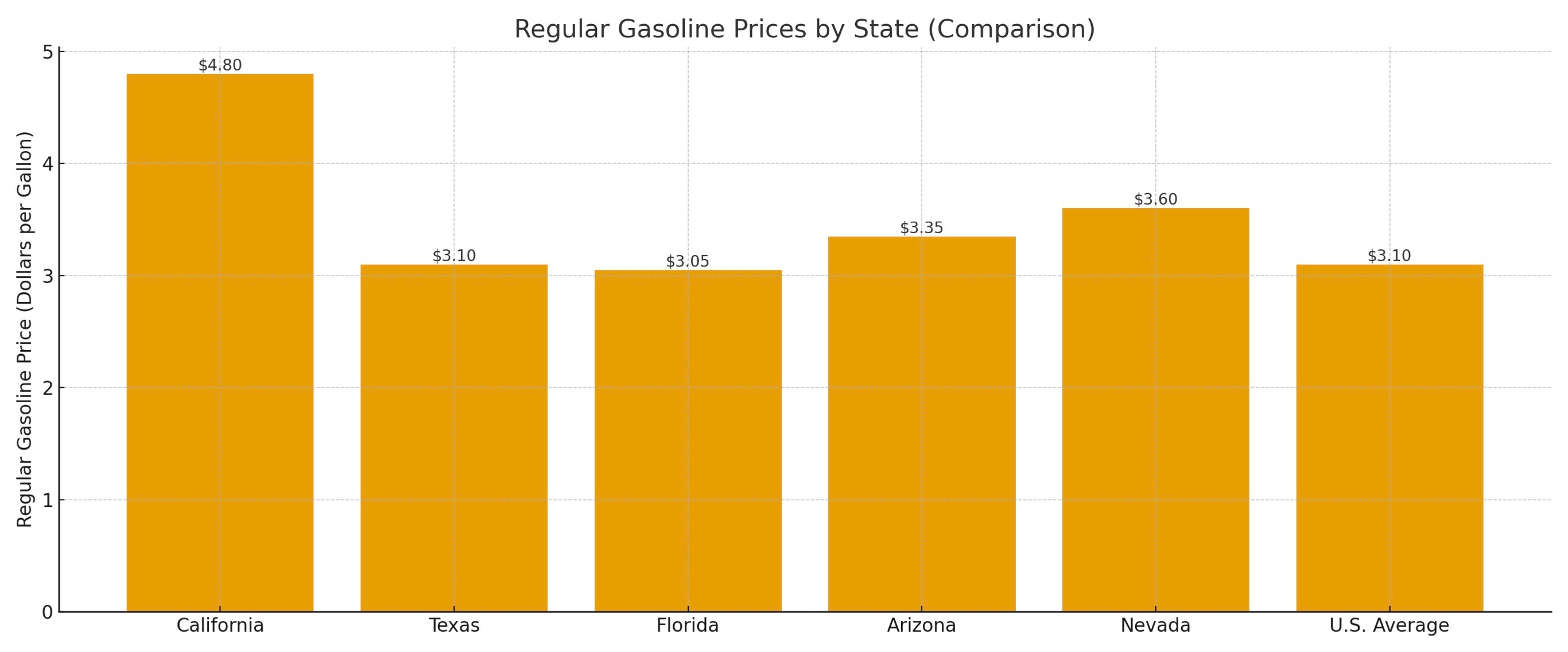 The same pattern holds at the gas station. California motorists routinely pay far more per gallon than drivers elsewhere in the country, and experience national energy volatility more severely than almost anyone else in America.