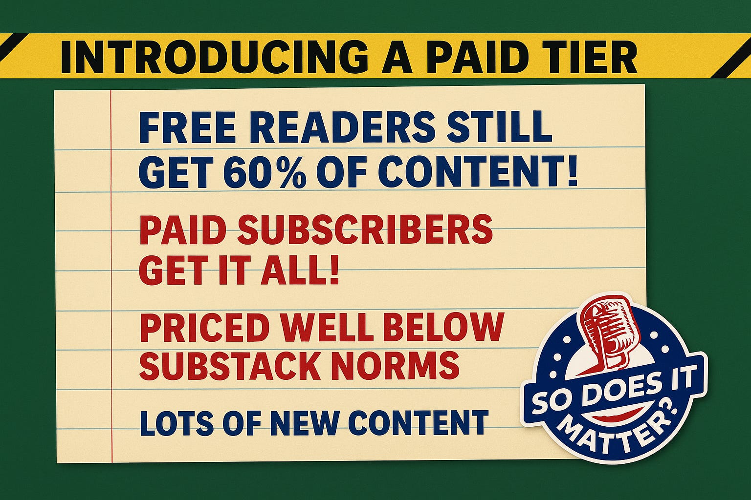 Anyone who has been a free subscriber knows that we produce solid content - every day of the week. Well, we will still have a free tier, and if that’s where are, you will continue to get a lot of great content - at least 60% of our content will always be free!