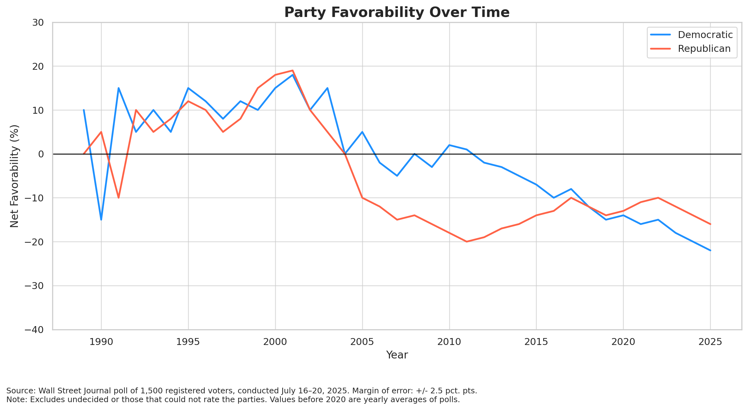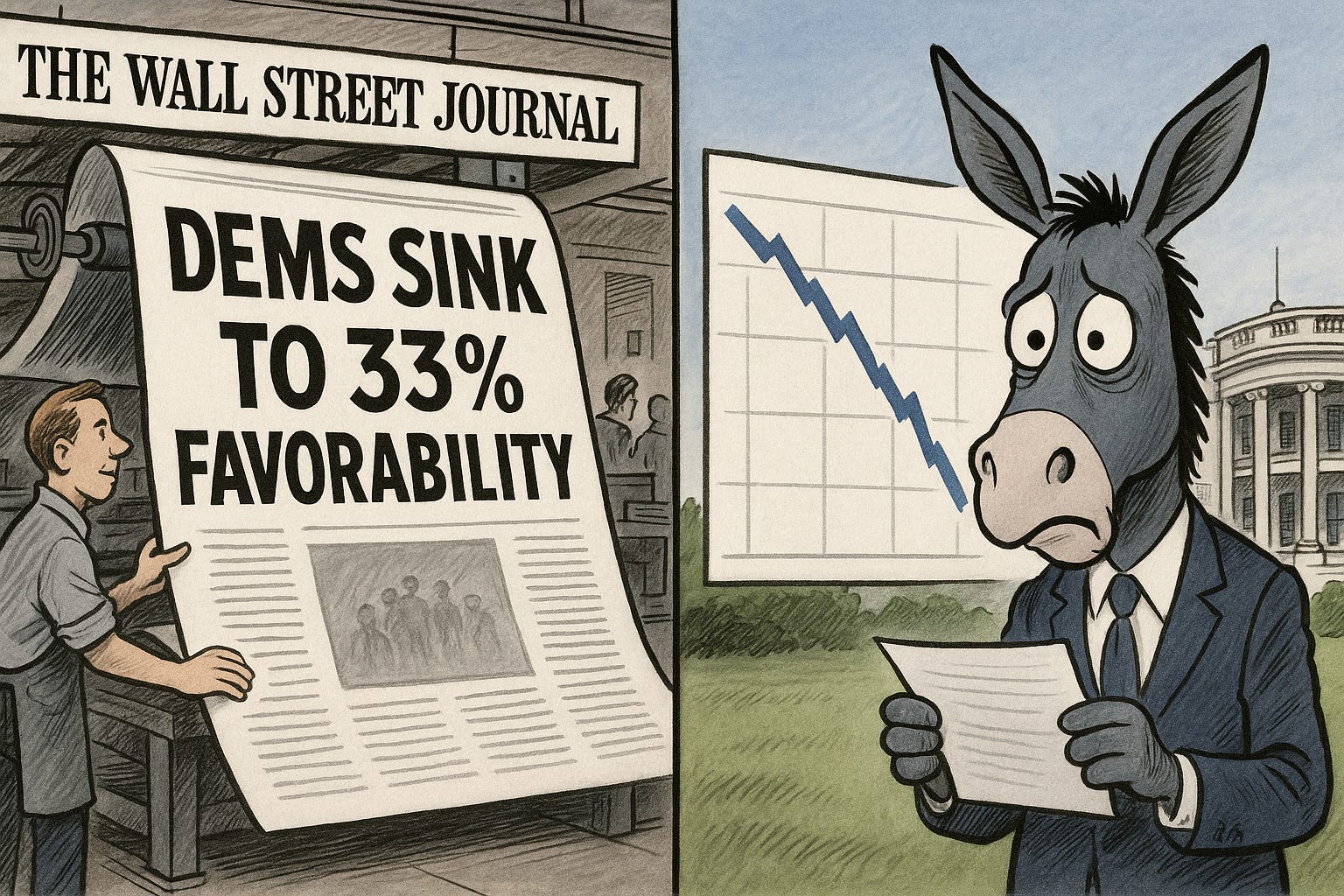 The numbers tell a stark story that Democrats cannot afford to ignore. A fresh Wall Street Journal poll, fielded between July 16-20, delivers what can only be described as devastating news for the party. Conducted by the seasoned polling duo of John Anzalone (a Democrat) and Tony Fabrizio (a Republican), the survey reveals that just 33% of voters hold a favorable view of the Democratic Party. In comparison, a crushing 63% view it unfavorably. This represents a net negative of 30 points—the worst showing for Democrats in more than three decades of Journal polling history.