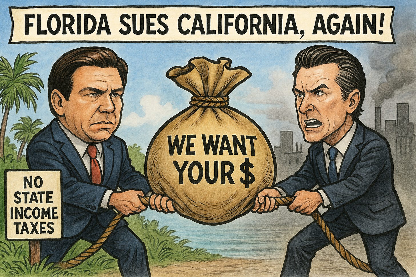 The long-running rivalry between Florida Governor Ron DeSantis and California Governor Gavin Newsom has now lead to another lawsuit filed with the U.S. Supreme Court. Florida is seeking to haul California into court over what it calls an unconstitutional tax grab, framing the case as the latest front in a clash of visions—one built on low taxes and growth, the other on heavier regulation and revenue extraction.
