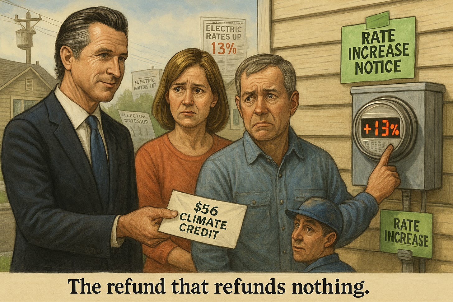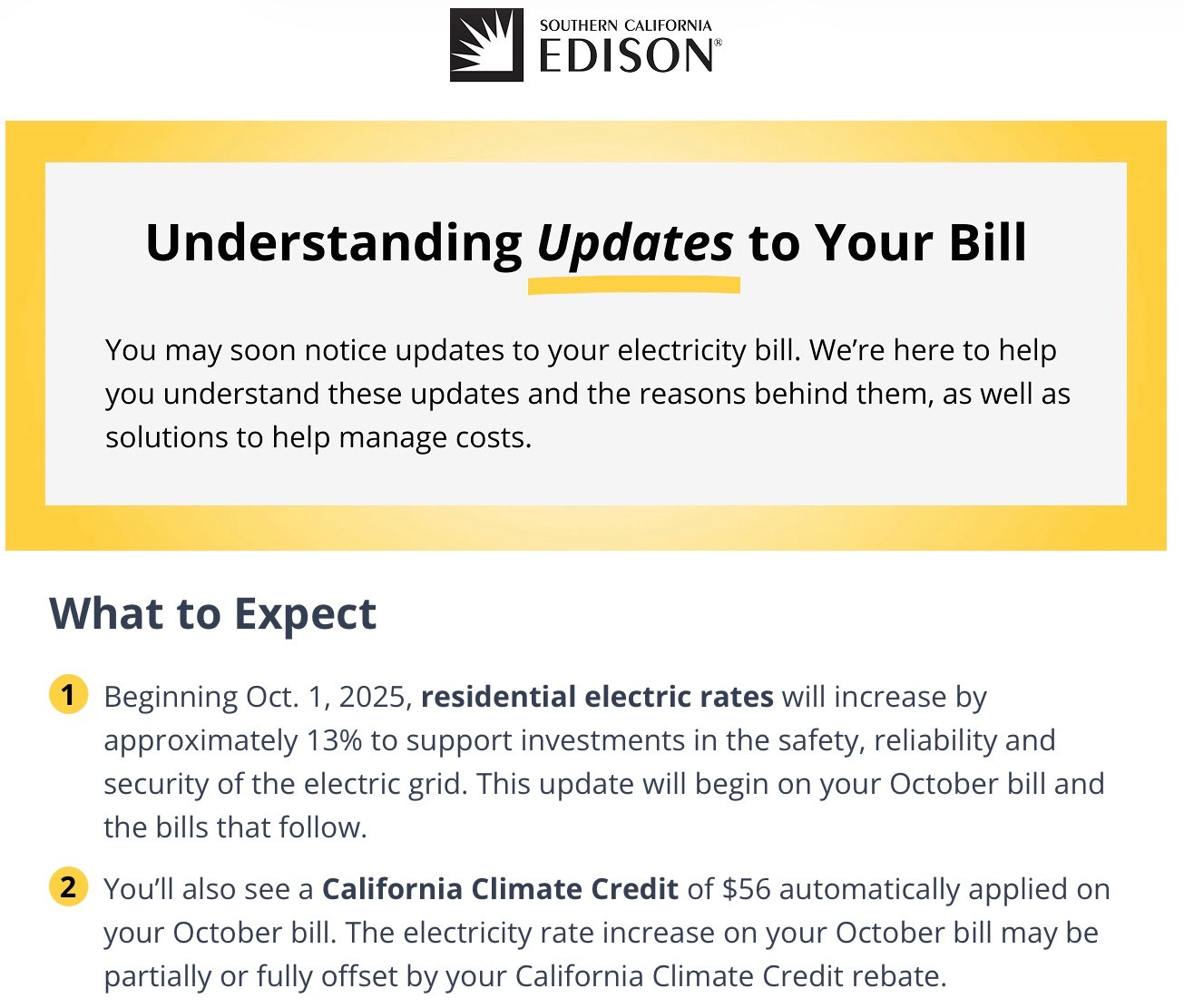 To make matters worse, right below this notice of a massive rate hike is a “courtesy” note about a $56 one-time California Climate Credit—hardly enough to cover even a month’s increase.