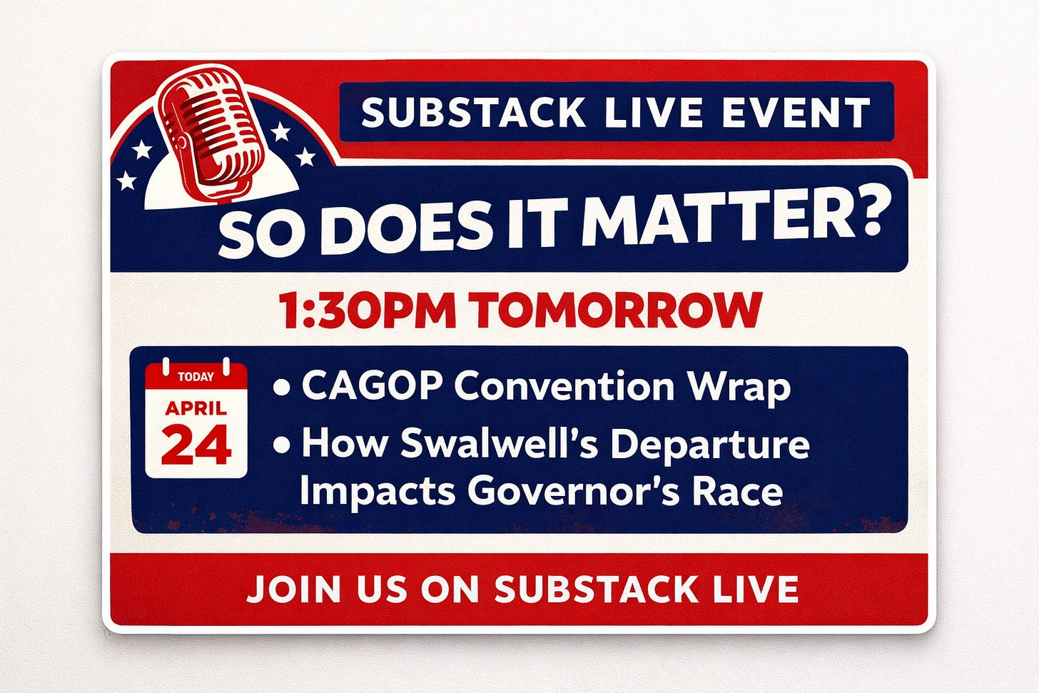 Going Live! Join Us Tomorrow at 1:30 PM - CAGOP Conv. Wrap - And Gov’s Race Sans Swalwell
