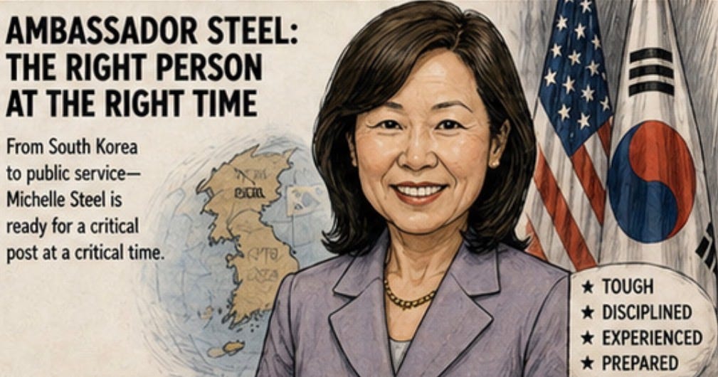 South Korea is not a ceremonial diplomatic post. It is a critical American ally facing North Korean threats, Chinese pressure, and serious domestic political turmoil. That requires someone who understands both American politics and Korean culture. Michelle Steel does. She was born in South Korea, built a remarkable public-service career here, and has the judgment and backbone for the job.