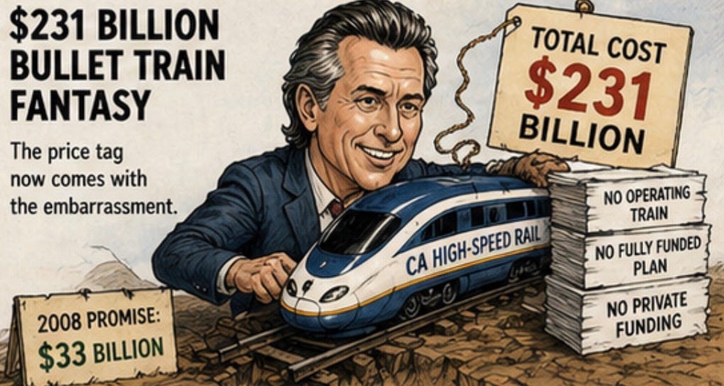 A new state review of California’s high-speed rail plan makes the obvious impossible to ignore: Gavin Newsom’s bullet train fantasy is not a transportation project anymore. It is a rolling fiscal embarrassment. The latest draft business plan pegs the full San Francisco-to-Anaheim system at roughly $231 billion, compared with the $33 billion dream voters were sold in 2008. Nearly two decades later, there is still no operating high-speed train, no credible, fully funded plan, and no private-sector cavalry riding to the rescue.