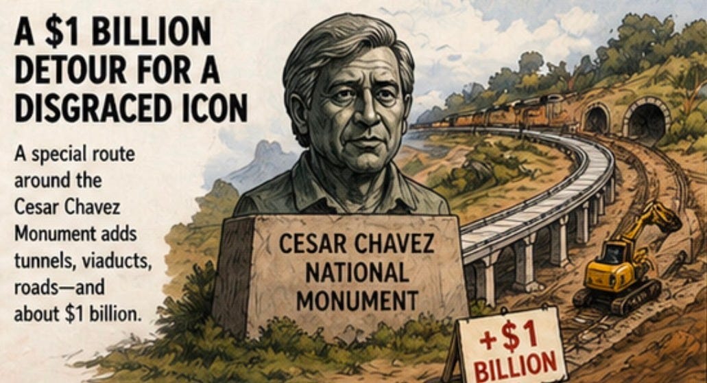 The irony is rich: the monument already sits beside an active freight corridor. But California’s bullet train bureaucracy bent over backward anyway, adding huge costs to avoid offending the political symbolism around Chavez — symbolism now complicated by serious abuse allegations. This is how megaprojects die in California: not from one bad decision, but from a thousand politically protected ones.