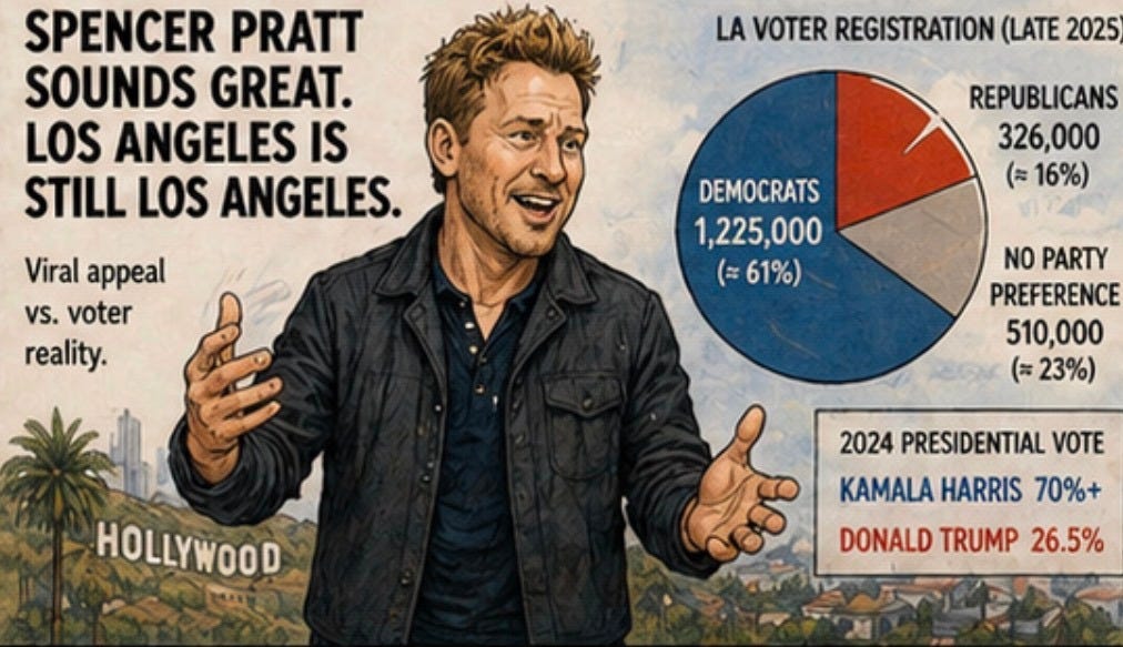 But Los Angeles is still Los Angeles. City registration numbers from late 2025 showed about 1.22 million Democrats and 326,000 Republicans — nearly a four-to-one gap — with another 510,000 no-party-preference voters. In 2024, more than 70% of city voters backed Kamala Harris, while just 26.5% voted for Donald Trump. Pratt is running in a nonpartisan race, but he has publicly identified as a Republican. If he even begins to look like a threat, the public employee unions Bass feeds so generously will be ready to remind the city’s Democrats exactly which candidate is in Trump’s party. Viral energy is real. So is voter registration.
