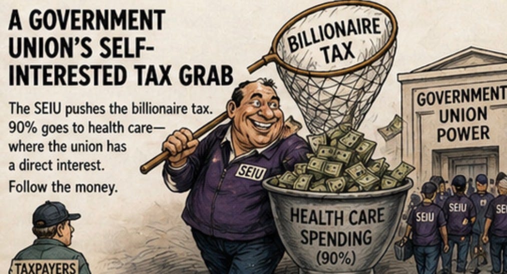 The most revealing part of California’s billionaire tax is not the tax itself. It is who is pushing it. The SEIU, one of the most powerful government employee unions in the country, is driving the measure, and 90% of the money would be routed into health care spending, where the union has direct institutional interests. That tells you almost everything you need to know.