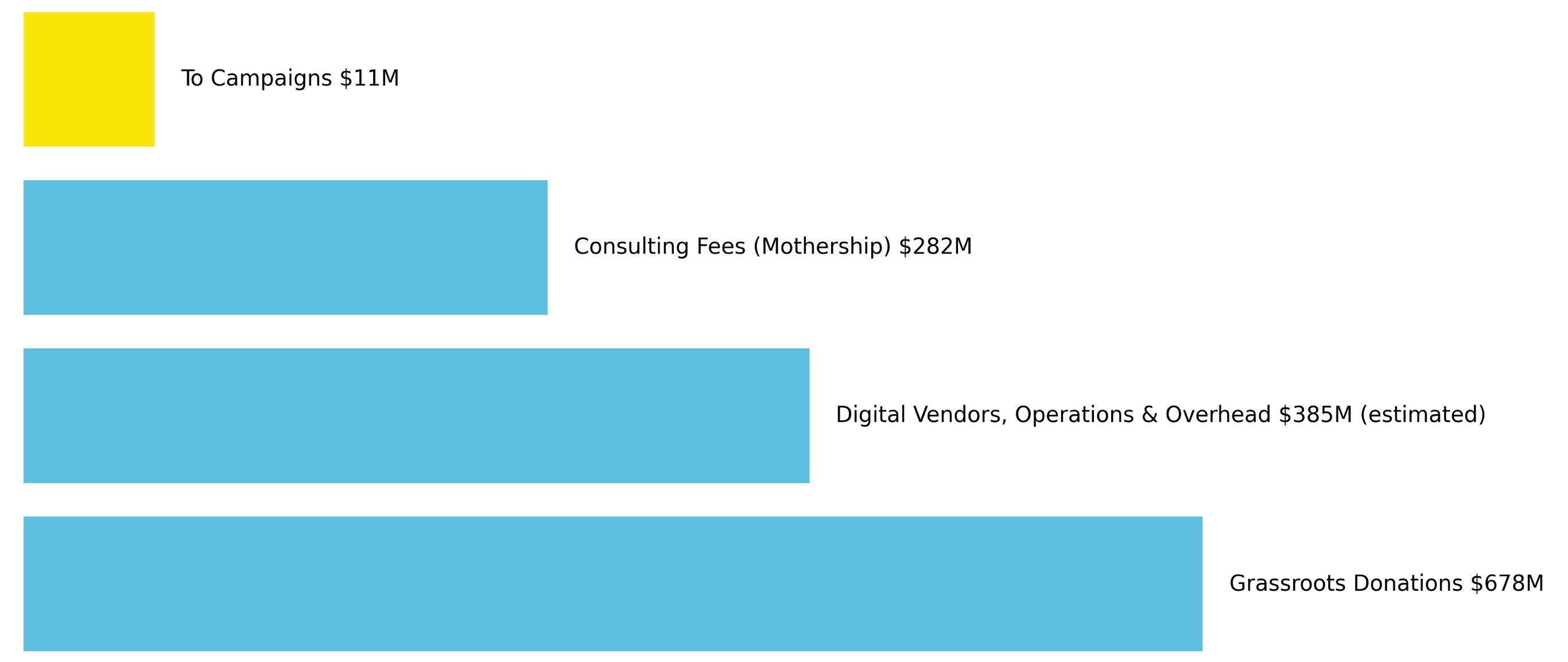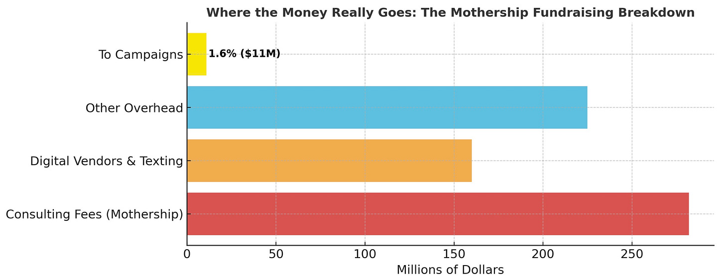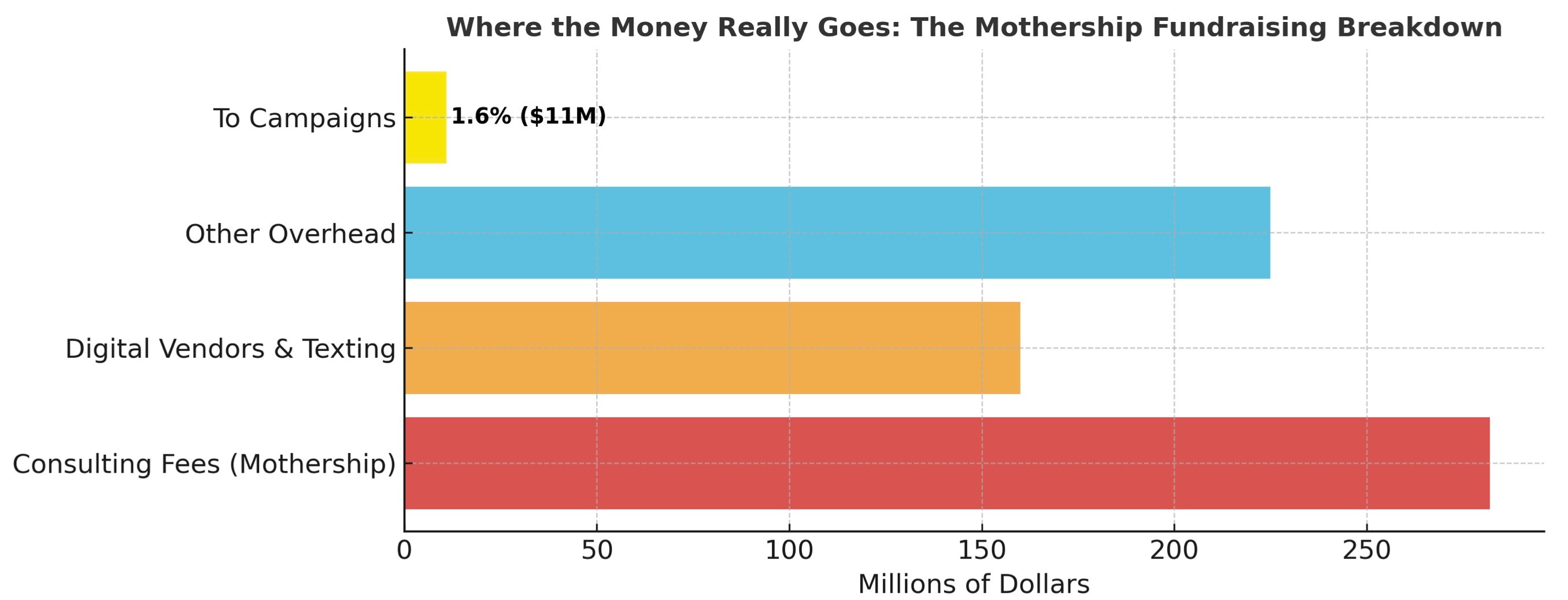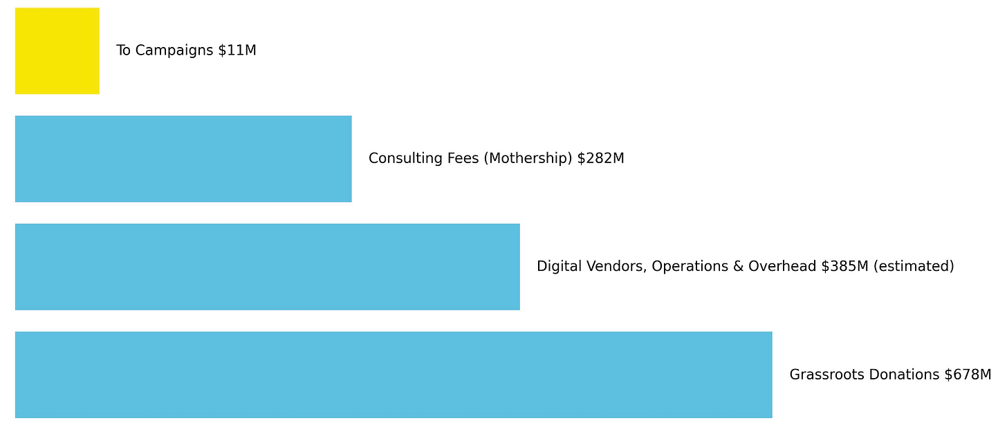 Since 2018, Mothership and a cluster of PACs tied to it have raised roughly $678 million. About $159 million flowed from those PACs back to Mothership, and $282 million went to the firm from every client on its roster. When the dust settled, only 1.6 percent of what was raised reached candidates or committees.