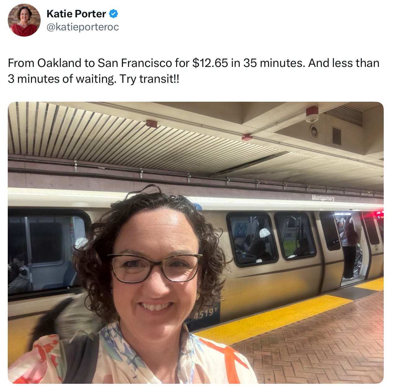 Guess who loves Bay Area public transit? None other than loony lefty former U.S. Rep. Katie Porter, the self-announced protege of Senator Elizabeth Warren. She posted on X her exuberance of what a great deal it is to take BART — so inexpensive. Well this ersatz Governor of California should do a little more research. That was a VERY expensive public train ride as transit in the Bay Area is in the middle of a fiscal emergency due to massive overspending, and fewer rides (not that they charge the riders very much, obviously. I wrote about the failure that is Bay Area Public Transit a couple of weeks ago.