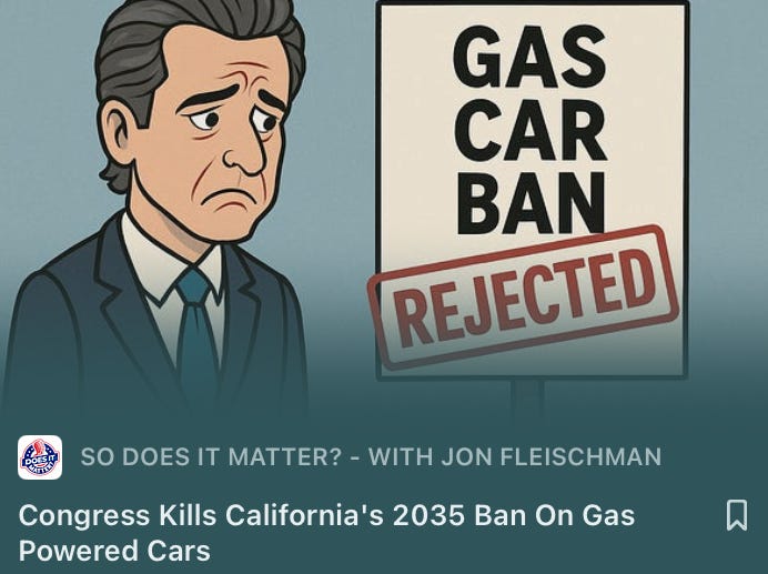 This week the U.S. Senate followed the House or Representatives in voting to cancel the waiver that the Biden Administration gave to California to impose a ban on the sale of gas-powered vehicles starting in 2035. There is a catch though…