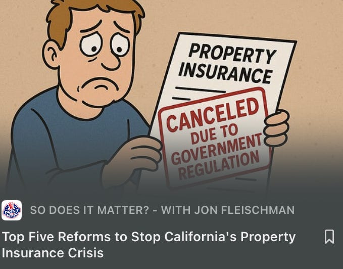 We are having a property insurance crisis in California. Policies are being cancelled. Rates are skyrocketing. And, of course, the root problem lies with California state government. How do we solve this situation?