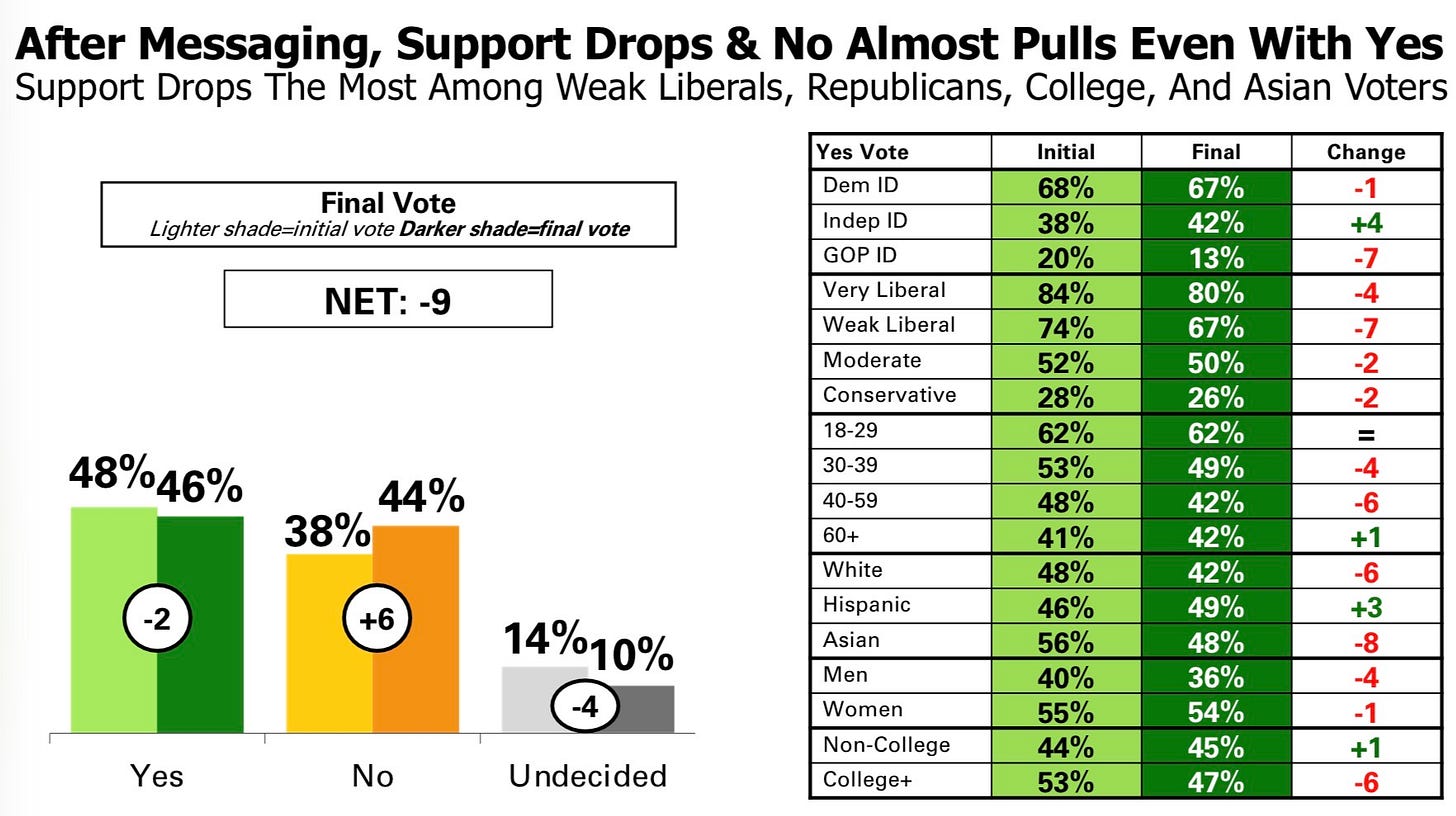 That erosion is concentrated among persuadable groups. Support drops seven points among Republicans, seven points among weak liberals, six points among college-educated voters, and eight points among Asian voters. Even among Democrats, support dips slightly once messaging is introduced. Initiatives that lose ground at this stage almost never regain it.