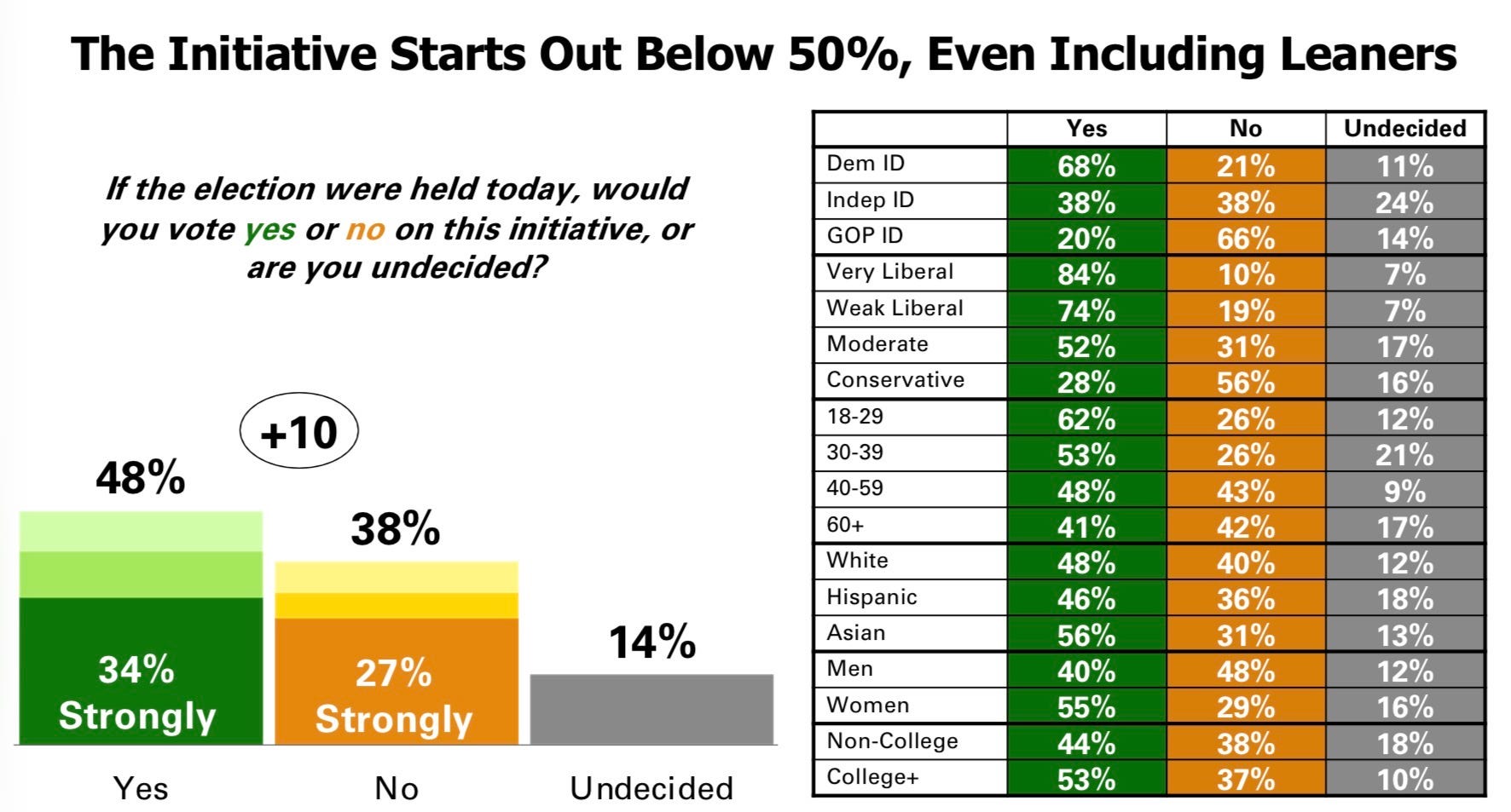 On the official title and summary language voters would see on the ballot, the initiative starts in a precarious position. Forty-eight percent say they would vote yes, 38 percent say no, and 14 percent are undecided. Measures that begin below 50 percent rarely have an easy path to passage.
