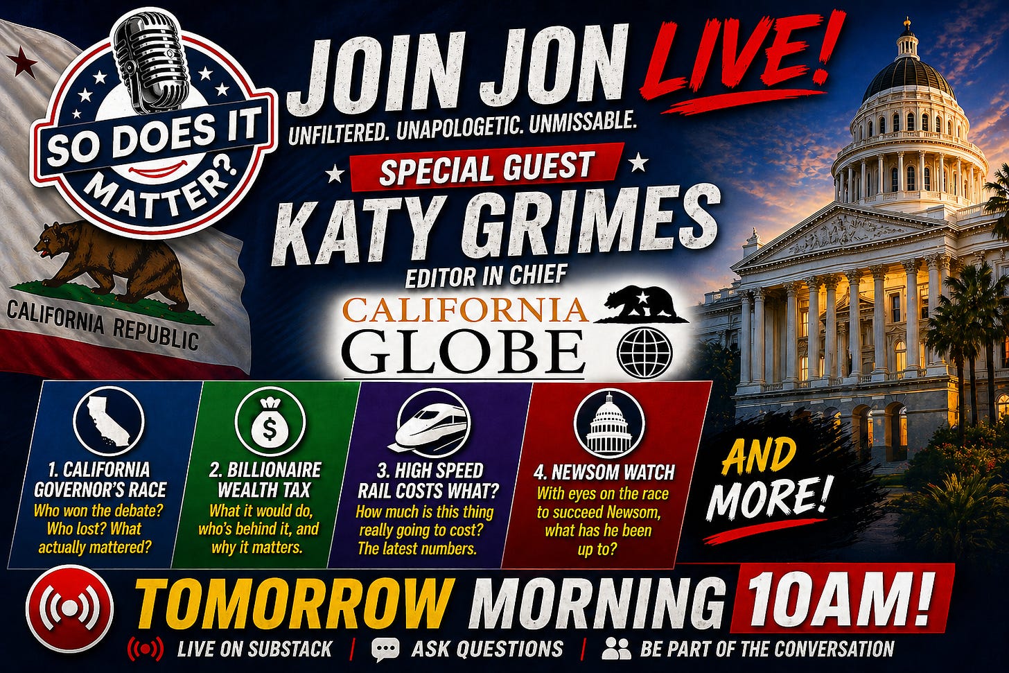 Jon's Going Live -- With Special Guest Katy Grimes of the CA Globe! Tomorrow morning, 10am! Topics: Gov's Race, Billionaire Tax, HSR, Newsom Watch!