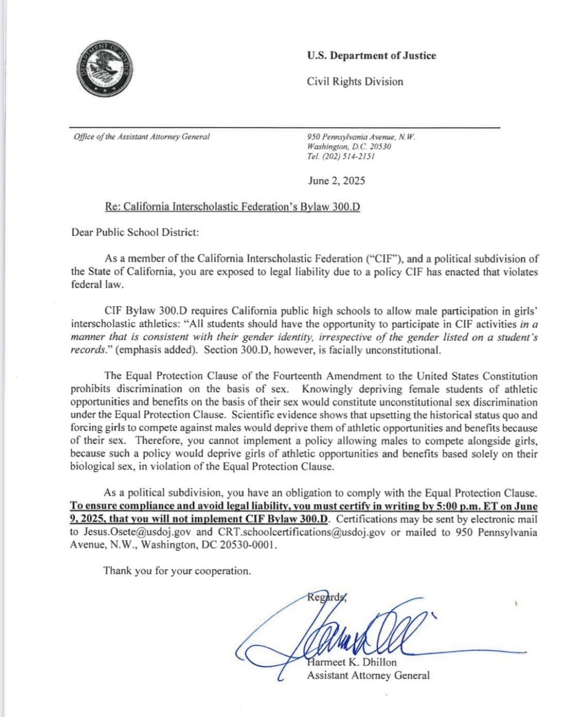 The United States Department of Justice's decisive move to challenge California's policies on biological male athletes participating in competitive women’s sports is an important step for fairness and equality. On Monday, Assistant Attorney General Harmeet Dhillon, head of the DOJ’s Civil Rights Division, wrote to California school districts, instructing them to cease adhering to CIF Bylaw 300.D, which permits athletes to compete based on their chosen gender identity rather than their biological sex. This policy, predicated upon a flawed 2013 state law, constitutes a violation of the Equal Protection Clause for excluding girls from athletic opportunities, and the DOJ is correct to say as much. Meanwhile, Governor Gavin Newsom and the CIF have doubled down on this injustice, to the detriment of our daughters, in the interest of political grandstanding.