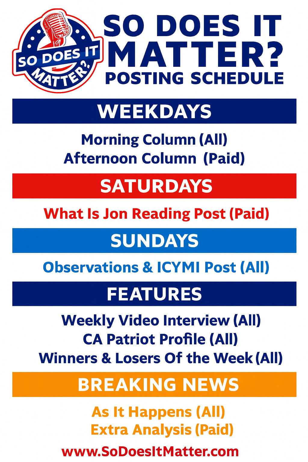 Jon Fleischman is the publisher of So, Does It Matter?, a California-focused political newsletter delivering independent reporting, sharp analysis, and insider perspectives. A longtime political strategist and former state GOP official, Jon has a reputation for calling political balls and strikes with fairness — even while holding a clear constitutional conservative viewpoint. His work has been cited by national and state media outlets, and he frequently comments on California politics in interviews and public forums.