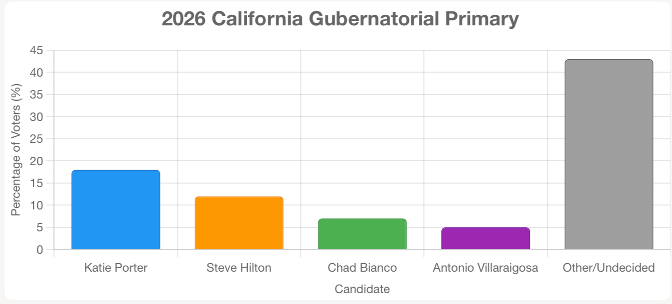 Katie Porter leads with 18%, strongest among voters over 50 (22%) and those with postgraduate degrees (35%). Steve Hilton’s 12% is notable for a newcomer, followed by Chad Bianco (7%) and Antonio Villaraigosa (5%). A combined 43% of voters are either undecided or support other candidates, down from 54% undecided in April, showing a race that’s still fluid and unpredictable.