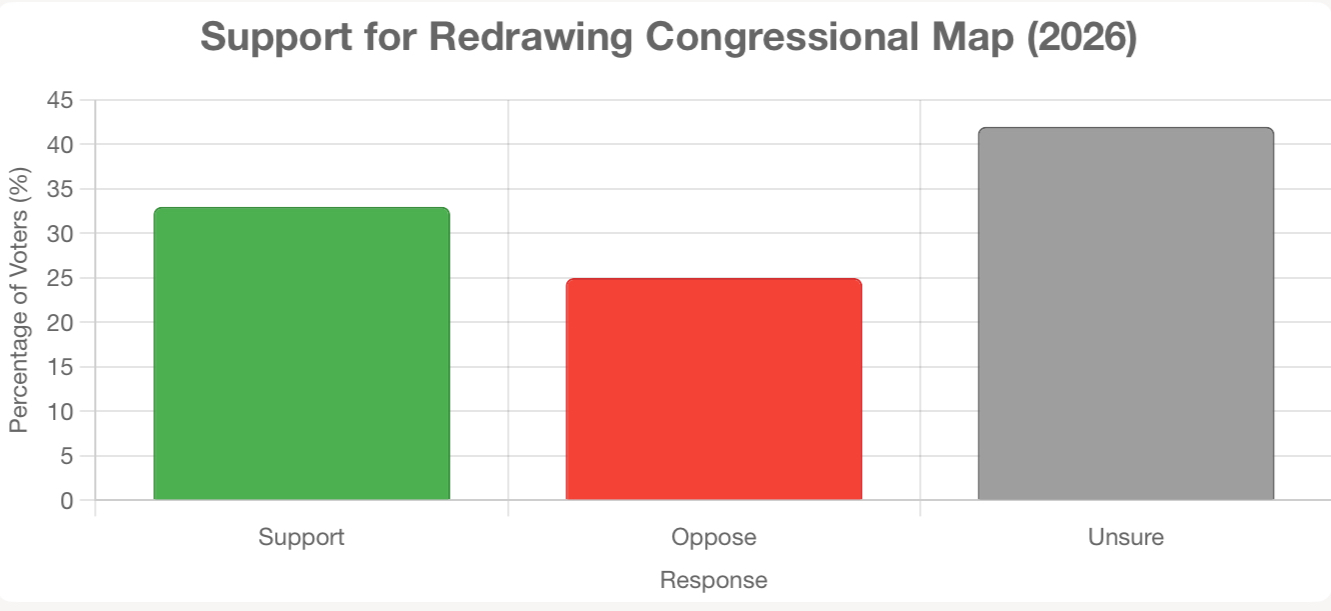 Democrats back the plan 42% to 19%, while Republicans lean against it, 36% to 28%. Independents are largely unsure at 52%, with only 23% supporting and 25% opposing. This chart shows a state hesitant to embrace mid-cycle map changes, with uncertainty dominating.