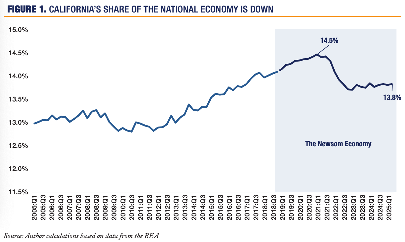 California’s share of the national economy peaked in 2021 and has since declined, while faster-growing states expand their footprint. That may sound small, but in an economy this large, it is significant. If California had simply held its position, the economy would be significantly larger today. Instead, other states are gaining ground at California’s expense, and the trend line should concern anyone who assumes California’s dominance is automatic.