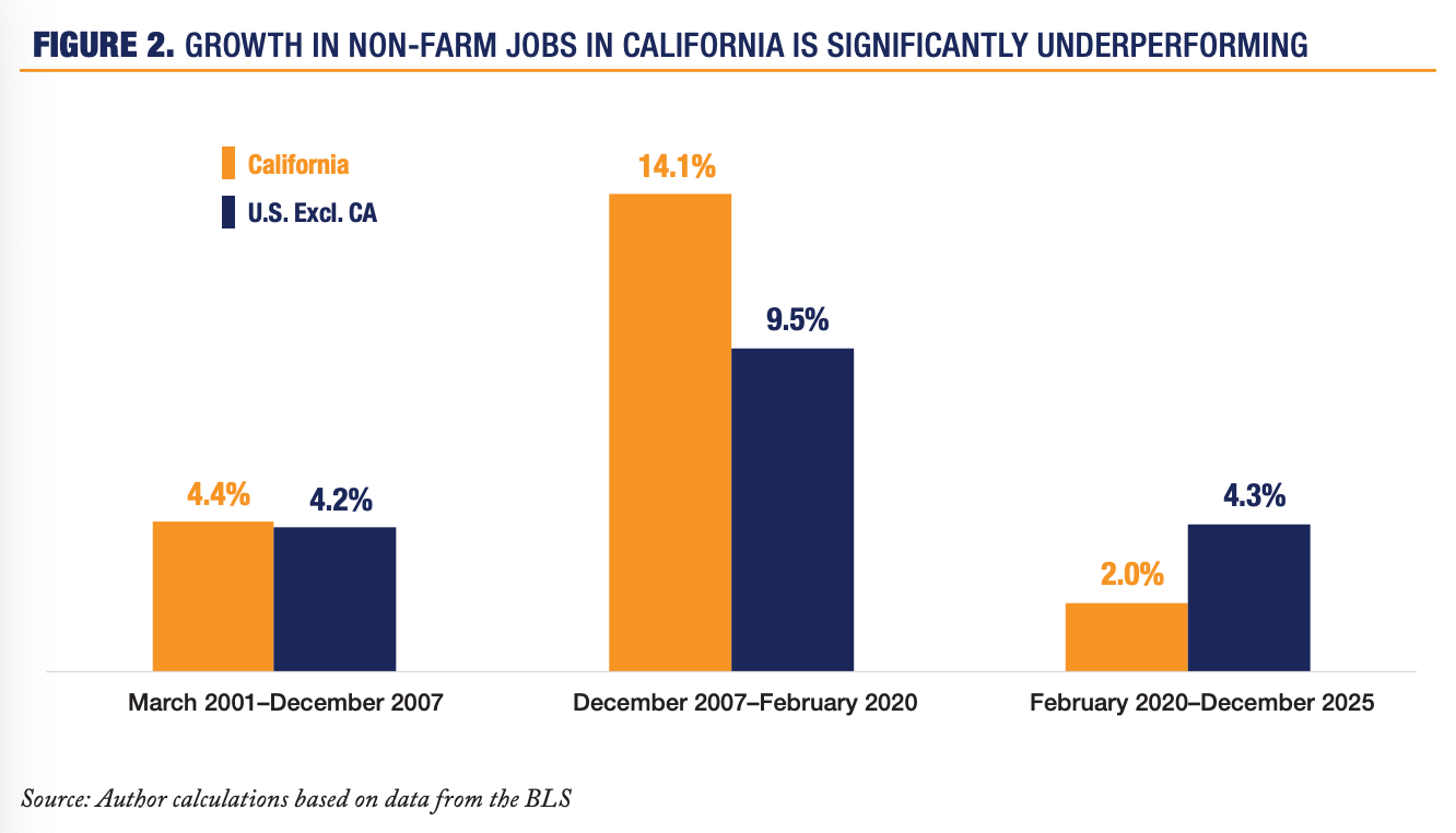 The most troubling trend is not GDP. It is jobs. Since the COVID recovery, California’s job growth has been less than half the rate of the rest of the country. That alone raises concerns about competitiveness and long-term trajectory, but the deeper issue lies beneath the surface.