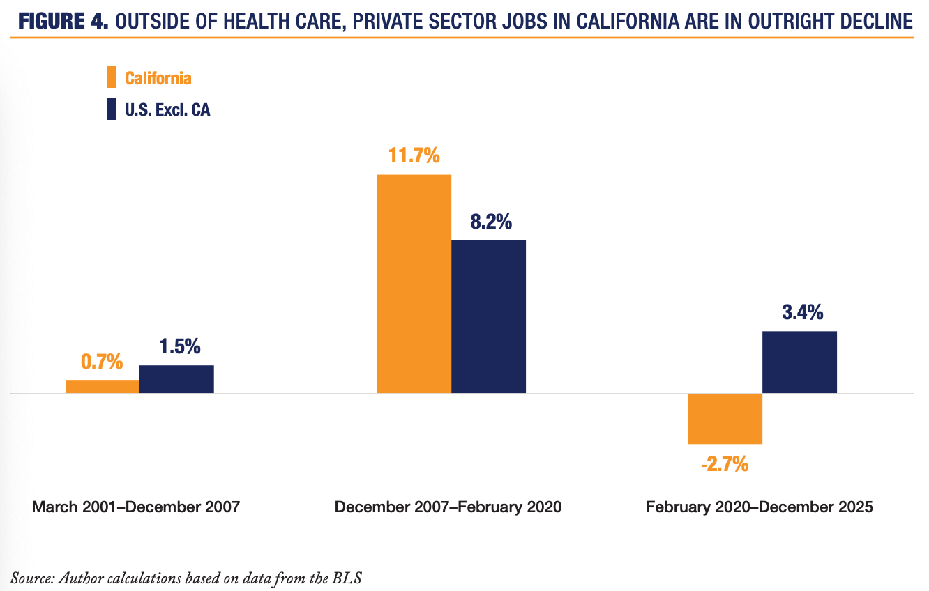 Private sector job growth, the kind that drives innovation and upward mobility, is lagging badly. Strip out healthcare and social assistance, and the picture becomes even more concerning. California is losing private-sector jobs outside healthcare. That is not what a leading economy looks like. It is what a mature economy losing momentum looks like.