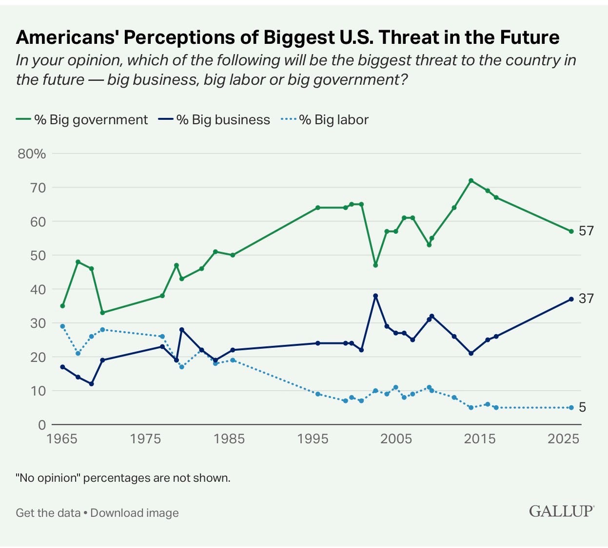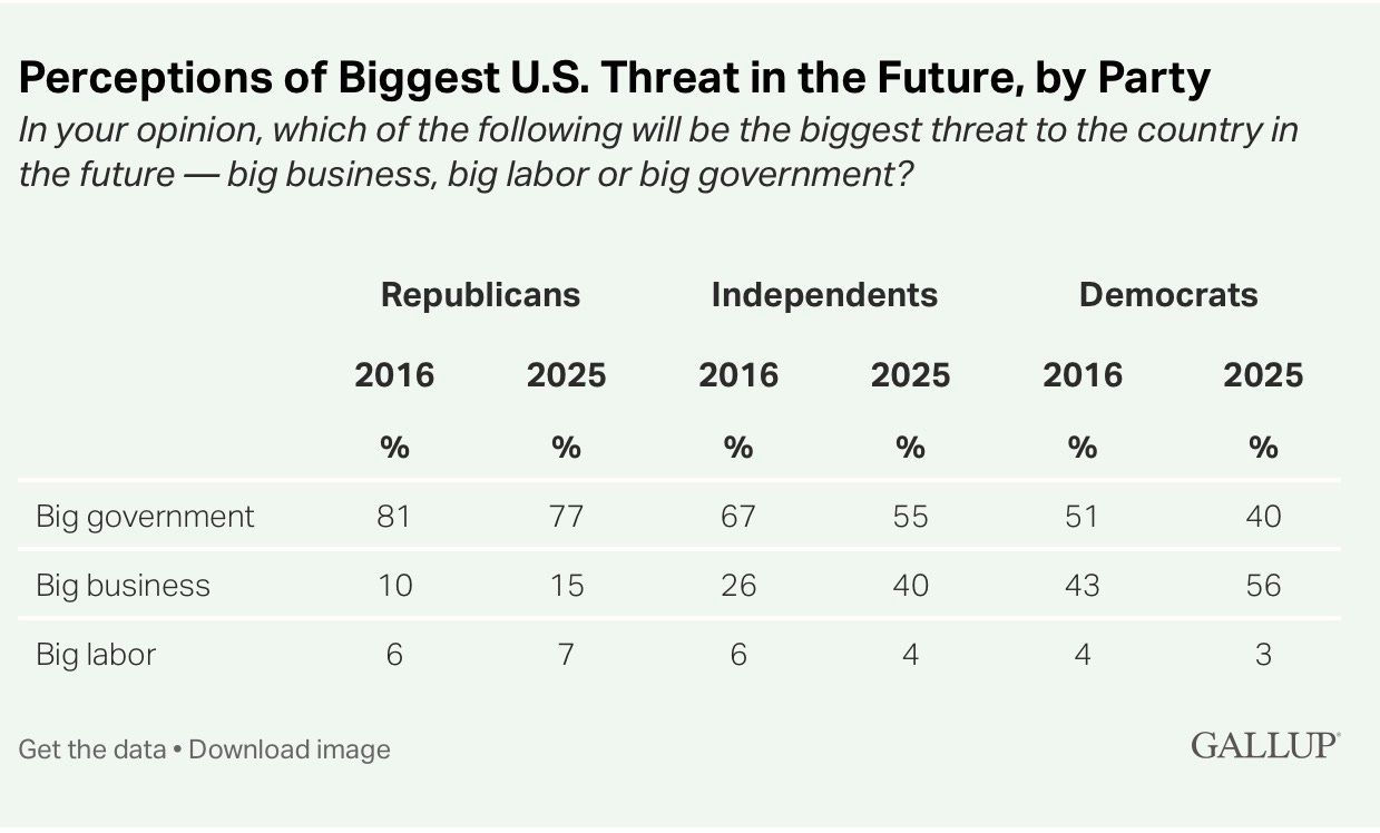 Still, big business is not seen as a bigger threat than big government. The real change shows up when Gallup asks a different version of the question that better matches how power works in daily life today.