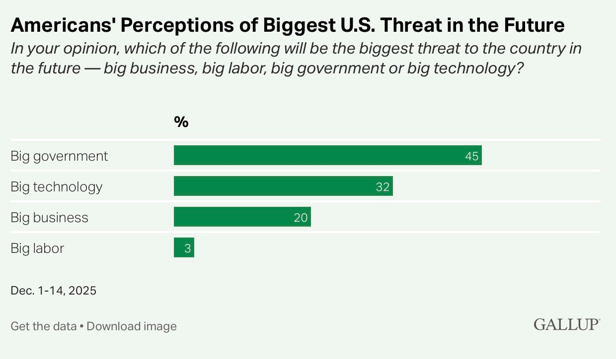 Now, 57 percent of Americans see big government as the biggest threat to the country’s future. This is still a clear majority, but it has dropped from nearly 70 percent in the last decade. The change does not mean people trust Washington more. Instead, it shows that people are uneasy about more institutions, not just government.