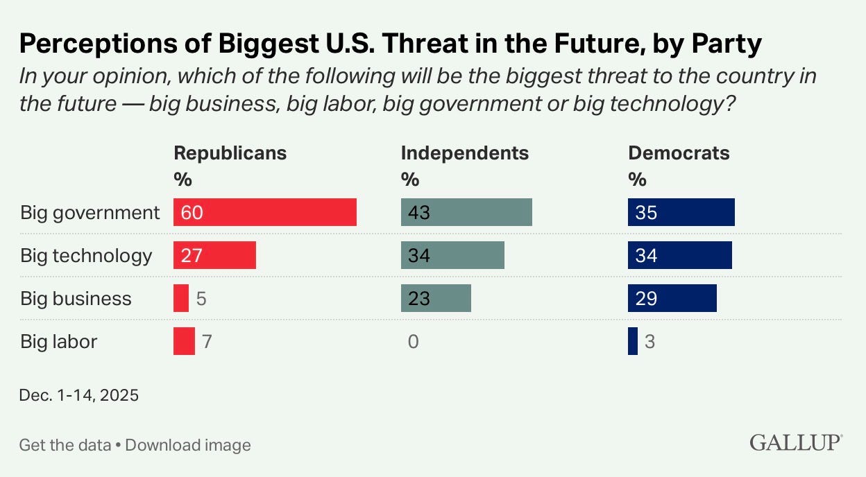 This data matters because it captures a shift in how Americans understand risk in the modern age. Big government remains the default concern, but the rapid rise of artificial intelligence has forced a broader reckoning about where authority now resides.