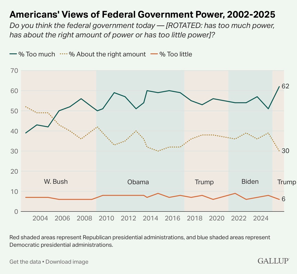Gallup finds the share of Americans who believe Washington has “too much power” has soared to its highest level since the question was first asked in 2002.
