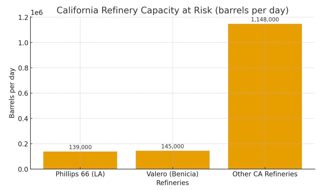 The fire lands as California’s refining base is shrinking. Phillips 66’s Los Angeles refinery is phasing out crude processing now and targets a full idle by late 2025. Valero’s Benicia refinery plans to close by April 2026. Together they account for about 17 percent of statewide capacity, according to federal energy data—a structural loss that amplifies every temporary outage….