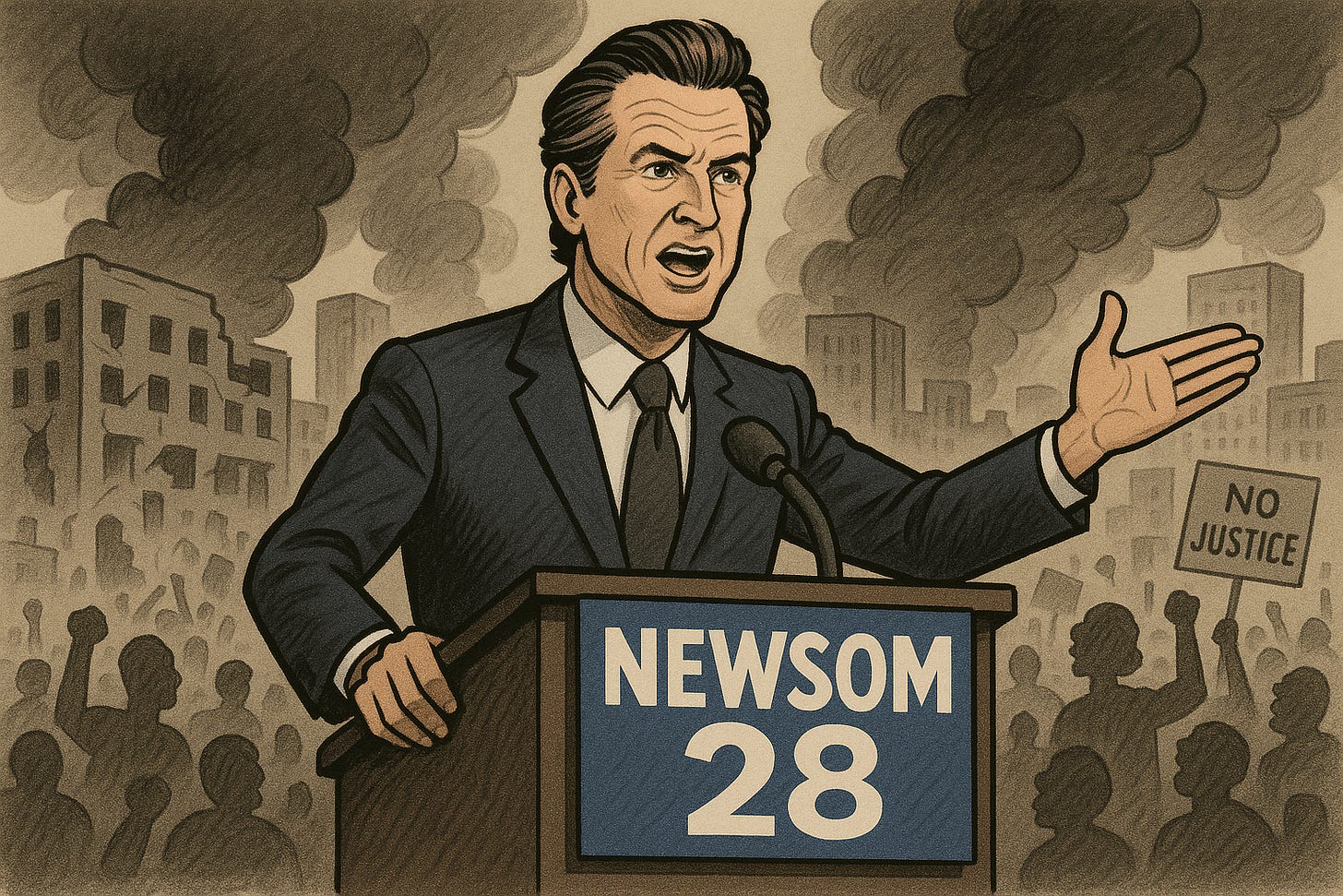 Gavin Newsom's eight-minute video message, posted last night, just minutes before downtown Los Angeles was placed in a 10-hour LAPD-enforced lockdown, was less a call for calm than an audition for the 2028 Democratic presidential primary. Newsom, as adroitly as usual, seizes a political opportunity to present himself as the “counterpoint” to President Donald Trump while taking precisely no responsibility for the chaos that is occurring on his watch. Newsom takes center stage, portraying federal immigration enforcement as a dystopian attack to build his national image. This isn't leadership—it's opportunism, exploiting a city's crisis for personal gain while disregarding the rule of law.