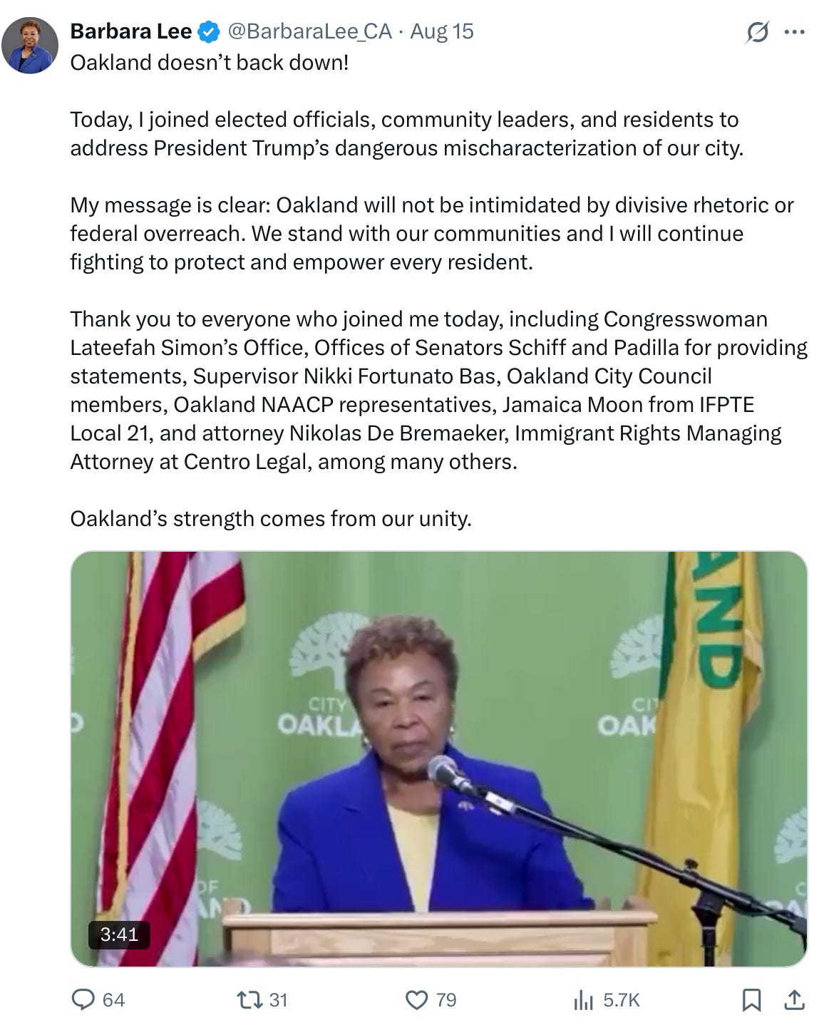 Mayor Bass leading a rally protesting anyone is a joke. She needs to look in the mirror. Her theatrics on Saturday were betrayal of the residents who need real solutions, not more posturing. Until leaders tackle the chaos at home with accountability and restraint, Oakland's decline will only deepen, leaving everyday families to bear the burden.