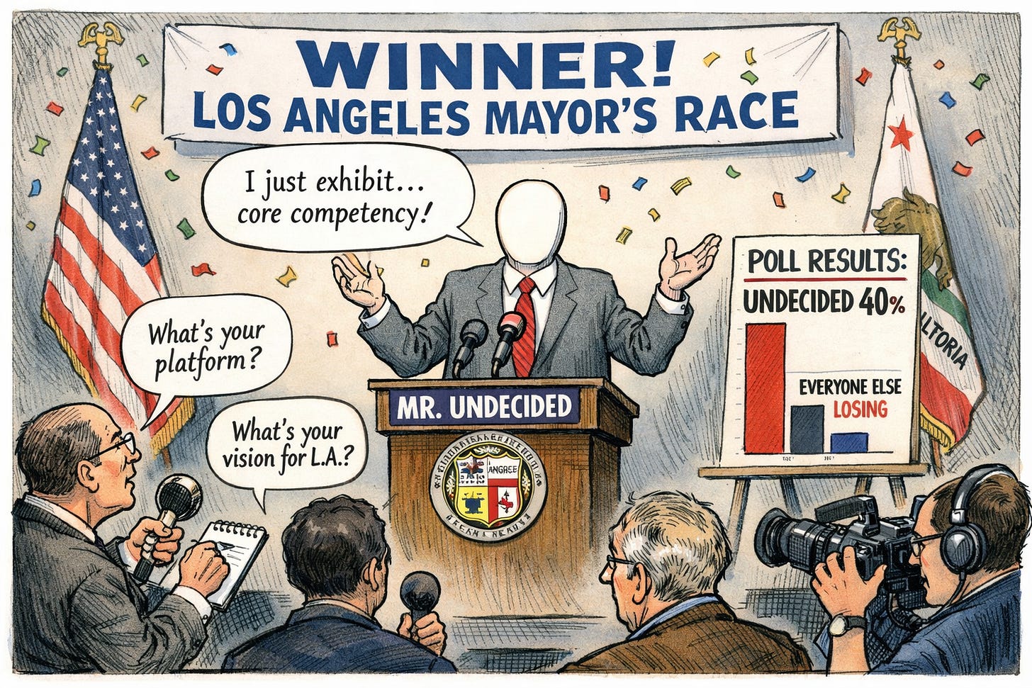 Of course, that is not an actual person. But according to the latest UCLA Luskin poll, it might as well be. Roughly 40 percent of likely voters say they have not made a choice. That is not just a large number. That is the dominant bloc in the race.