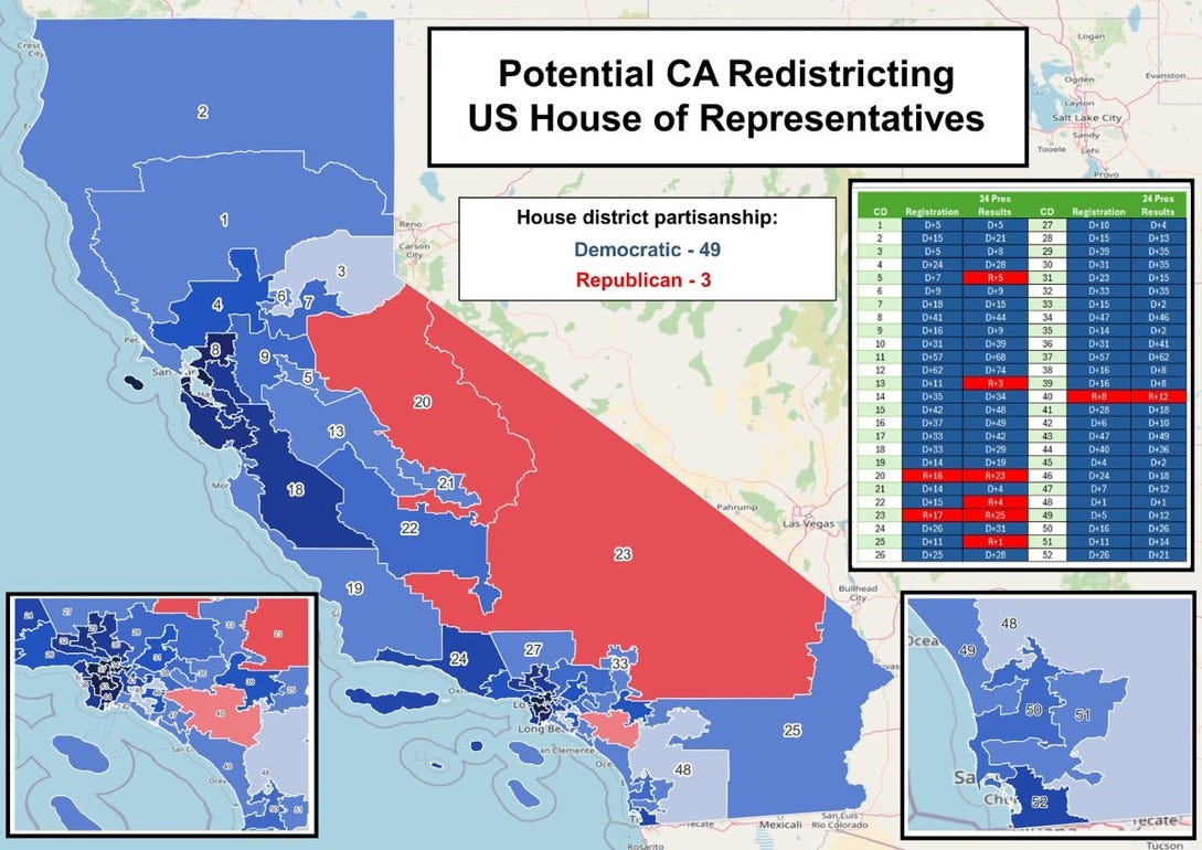 I wrote on Wednesday about how the map I have seen floated around creates a 49-3 Democrat House District advantage. I said, “I spoke with a California redistricting expert yesterday. For those curious, with this map, Rep. Darrell Issa would be the only Republican sitting pretty, with a re-election to a very red district secure. For the other two Republican seats that would be very safe, two GOP incumbent members would have to duke it out. Vince Fong and Jay Obernolte are in one, and Tom McClintock and Kevin Kiley are in another. Brutal. Oh yes, you would say bye-bye to not only the loser of each of those two showdowns, but also Doug LaMalfa, David Valadeo, Young Kim, and Ken Calvert.”