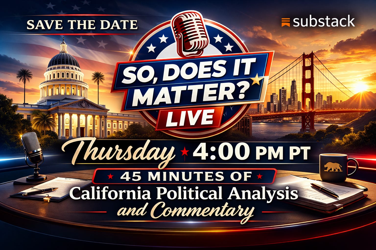 Save The Date/Time: We Will Go Live Again This Week For Another Session On California Politics - Thursday, 4pm!
