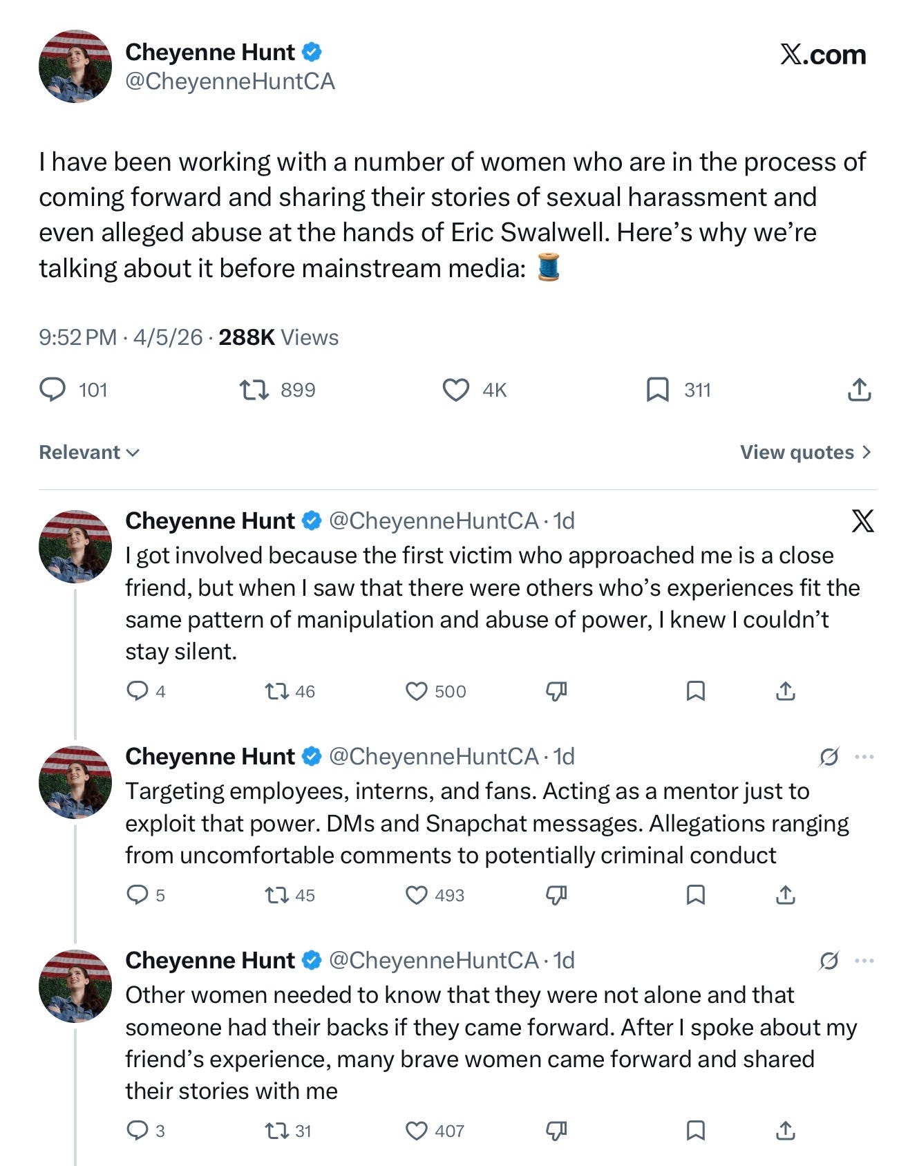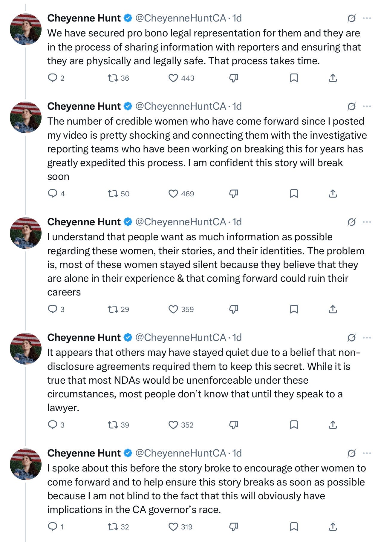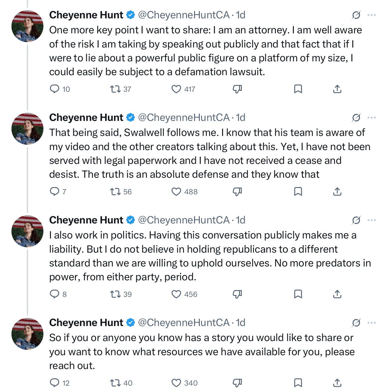 But Democratic activist and head of the progressive organization Gen-Z for Change, Cheyenne Hunt, has publicly said she is working with multiple women who are preparing to come forward with allegations against Swalwell. She has said they include women from different parts of his orbit, that they are taking legal precautions, and that they are communicating with reporters.