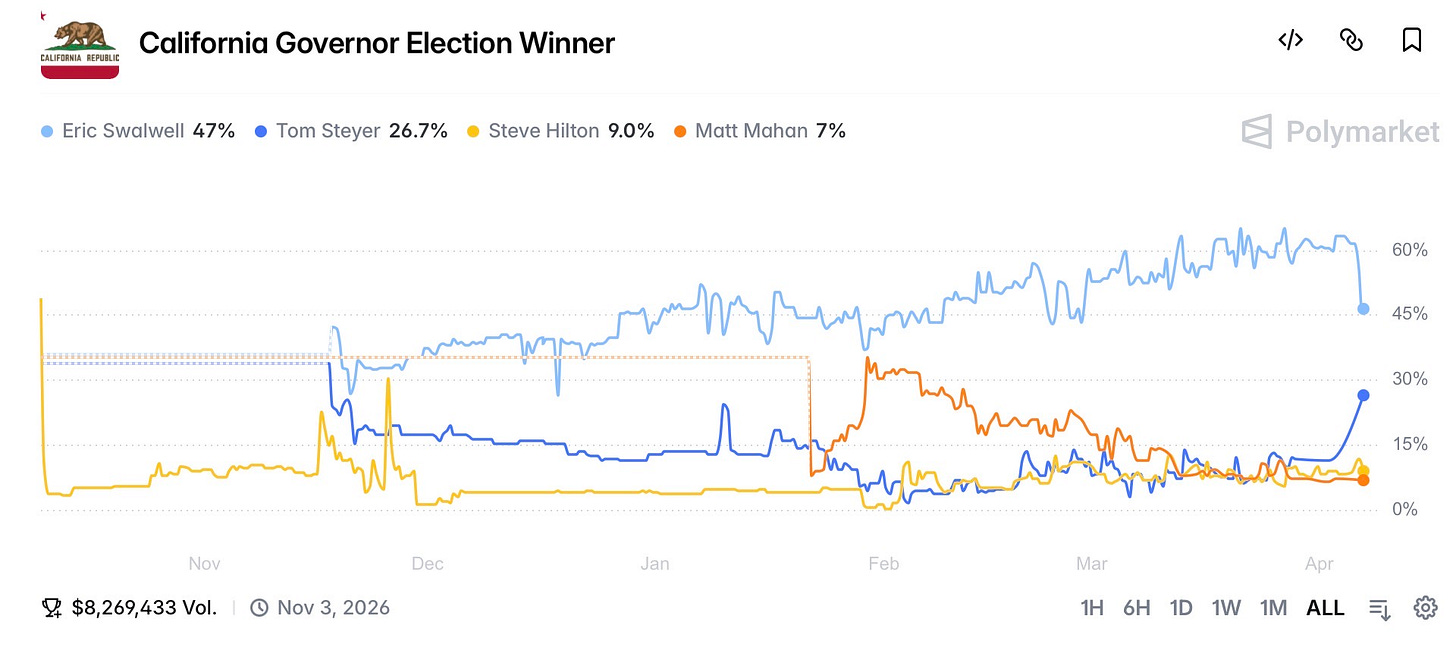 This is important because Eric Swalwell is a leading Democrat in the governor’s race, polling about even with Tom Steyer and Katie Porter, and has built strong support. He’s also secured major labor endorsements, including from the California Teachers Association and SEIU California.